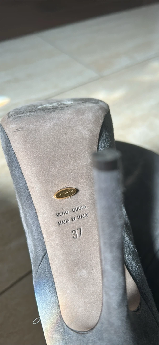 Selling a pair of Rosso Vero ankle boots in a lovely grey suede! They're a European size 37. These stylish boots are perfect for adding a touch of elegance to any outfit. The heel is in great condition and they have a zip on the side