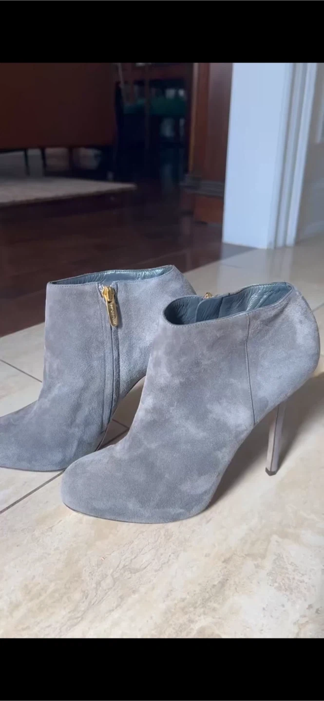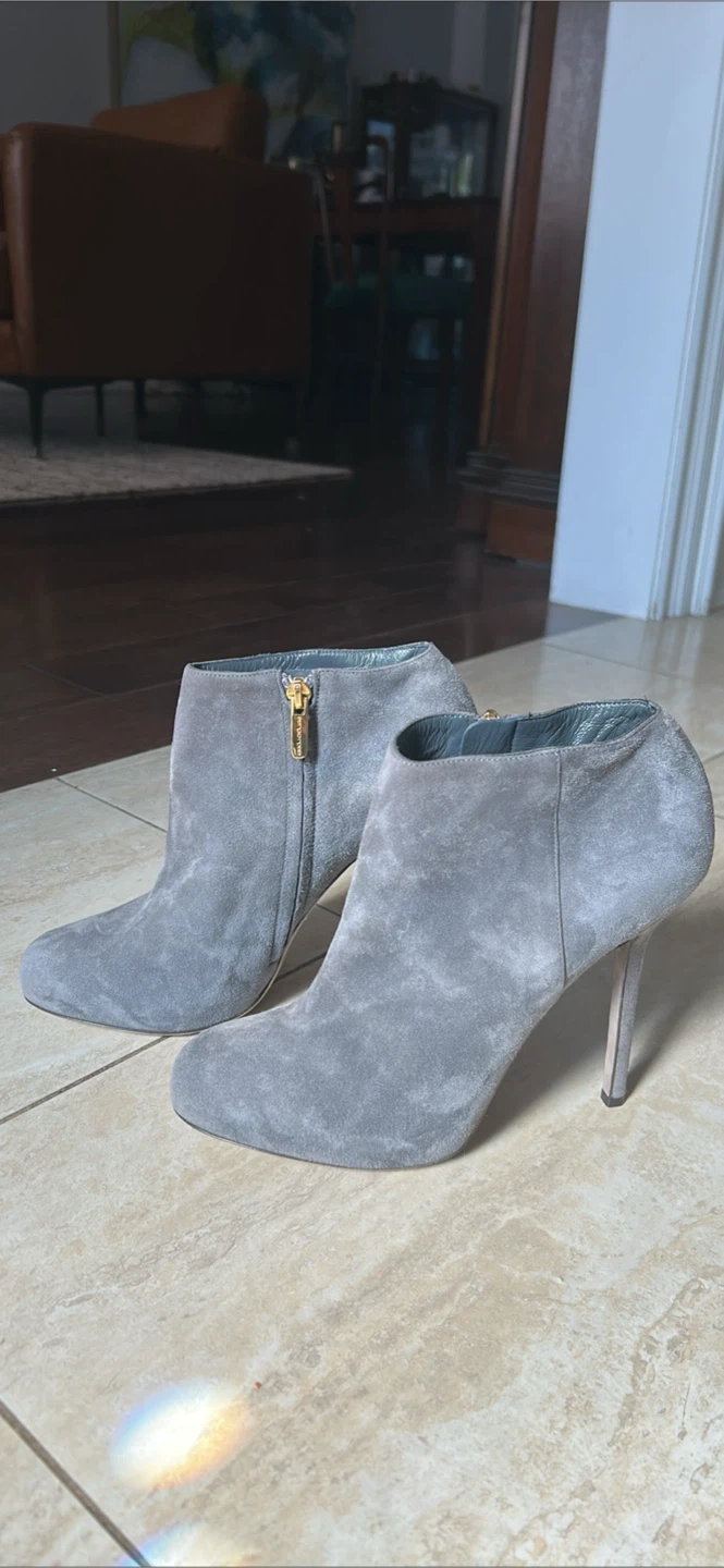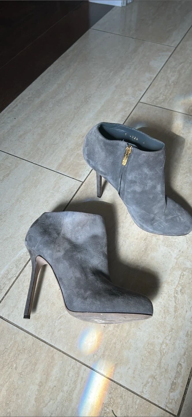 Selling a pair of Rosso Vero ankle boots in a lovely grey suede! They're a European size 37. These stylish boots are perfect for adding a touch of elegance to any outfit. The heel is in great condition and they have a zip on the side