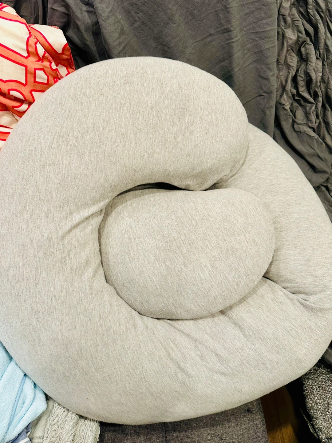 Comfortable light grey nursing pillow. Its U-shape provides great support for moms and babies during feeding. The soft cotton blend cover is breathable and washable.