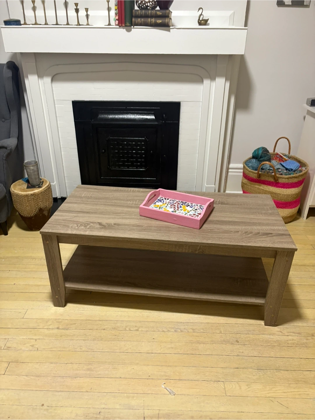 Selling a coffee table with a shelf underneath, perfect for living room storage or decor. It's in great condition and has a neutral wood-grain finish that would match any decor. There are some minor signs of wear on the top surface.