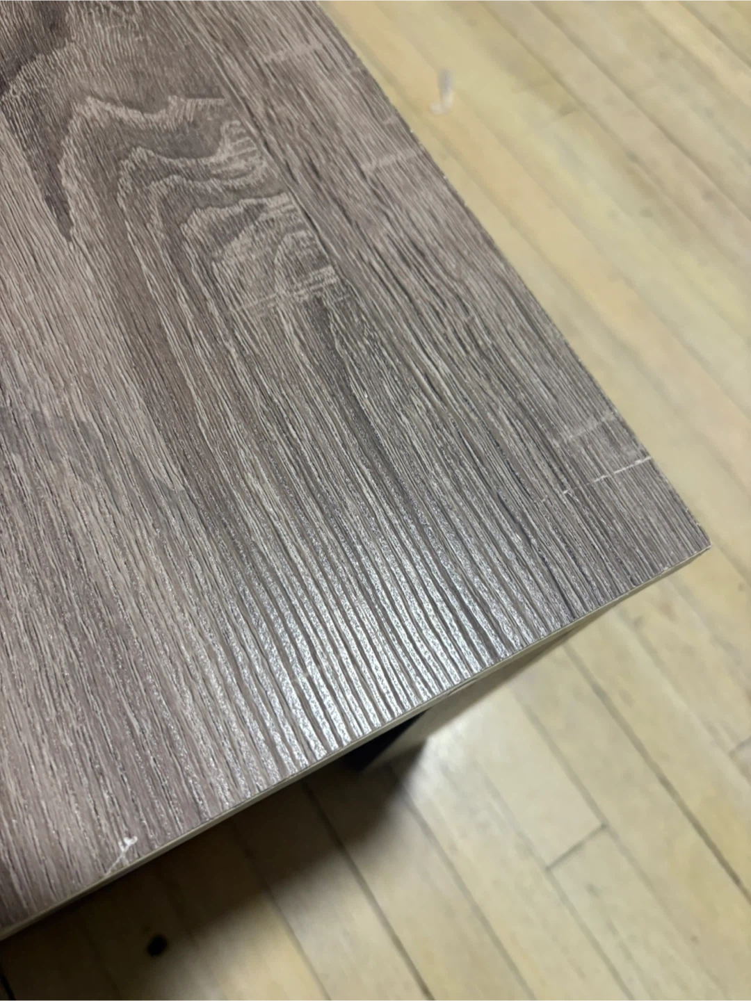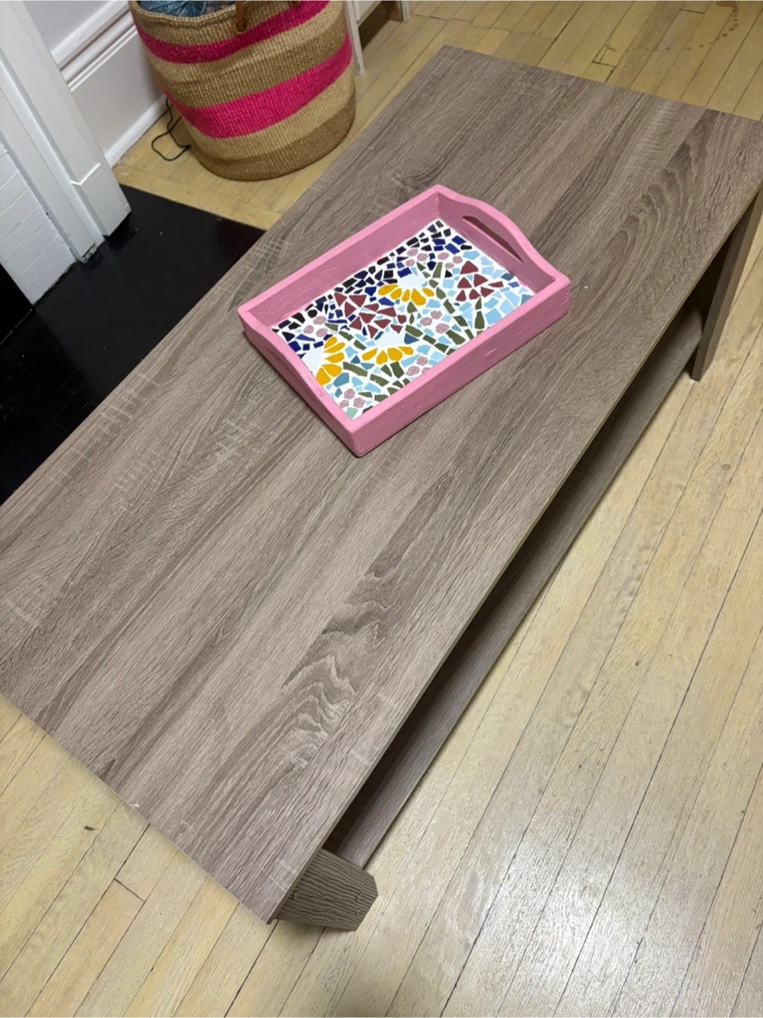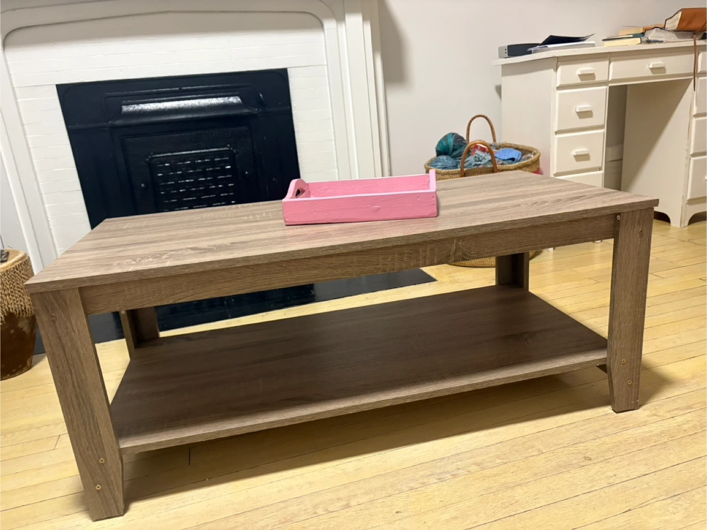 Selling a coffee table with a shelf underneath, perfect for living room storage or decor. It's in great condition and has a neutral wood-grain finish that would match any decor. There are some minor signs of wear on the top surface.