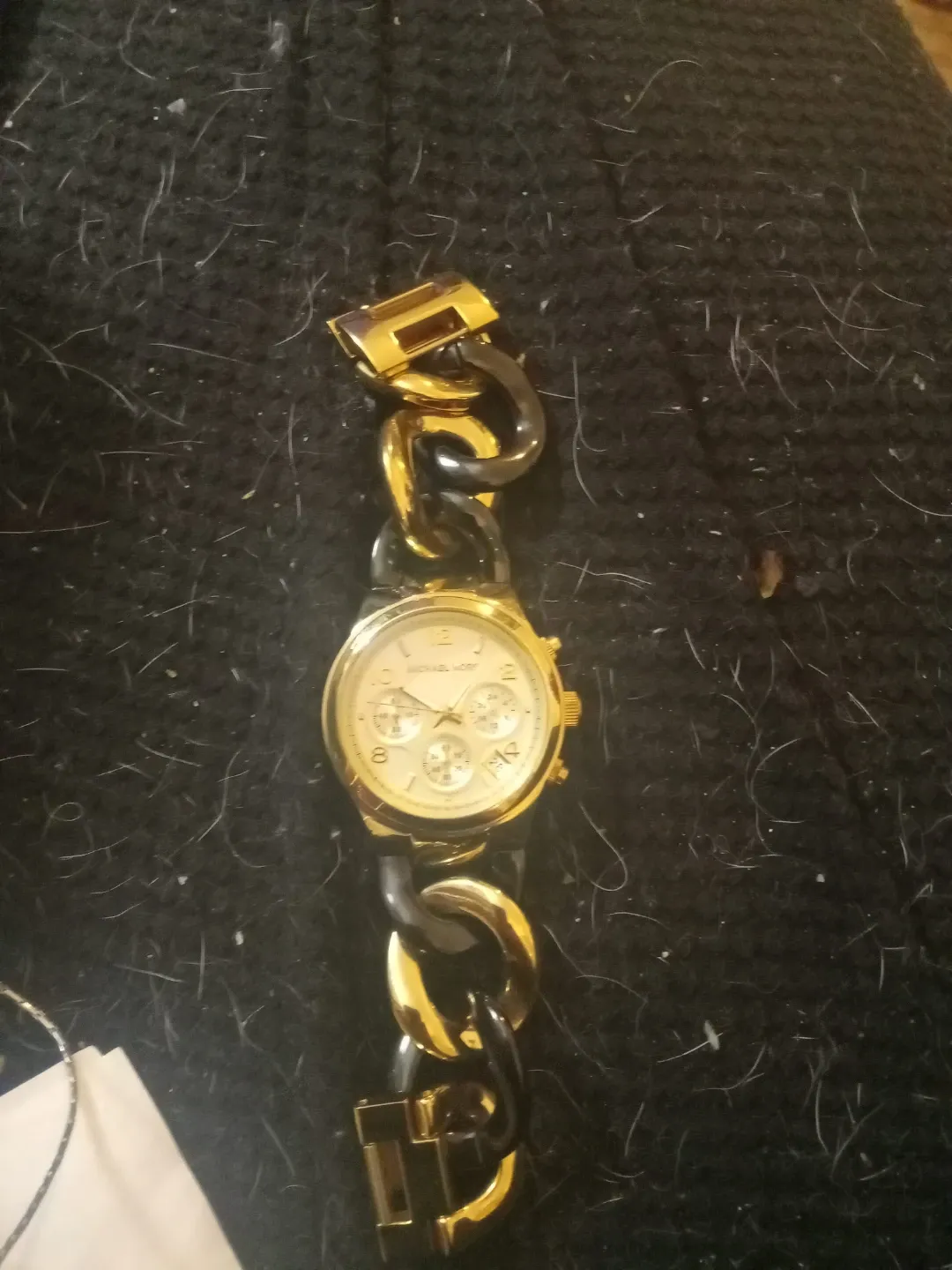 This Michael Kors chronograph watch features a gold-tone case and a bold black and gold link bracelet. It includes multiple subdials for timekeeping functions. Its stylish design makes it a great accessory!