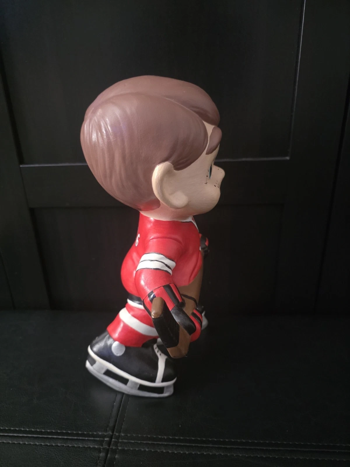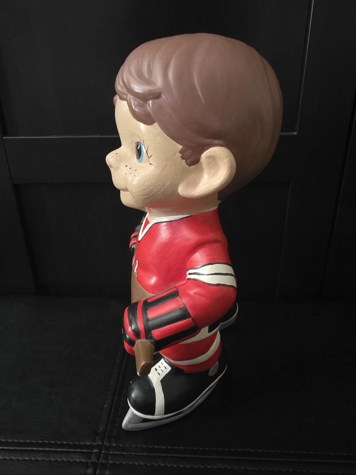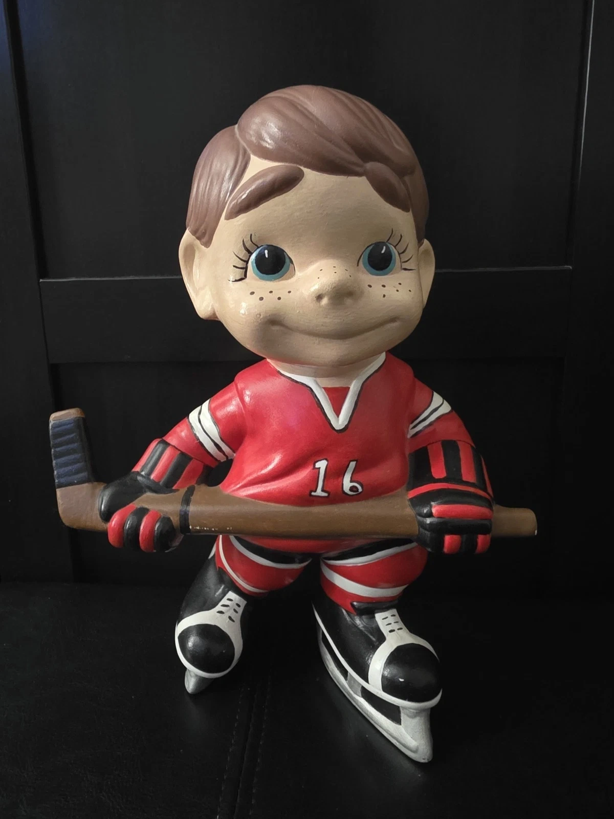 Used ceramic hockey player figurine from Atlantic Mold. Features red, white, and black colors. Handmade in the United States during the 1970s. Item height is 10.5 inches.
