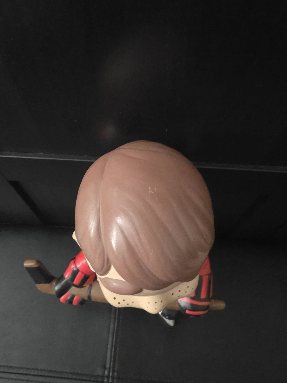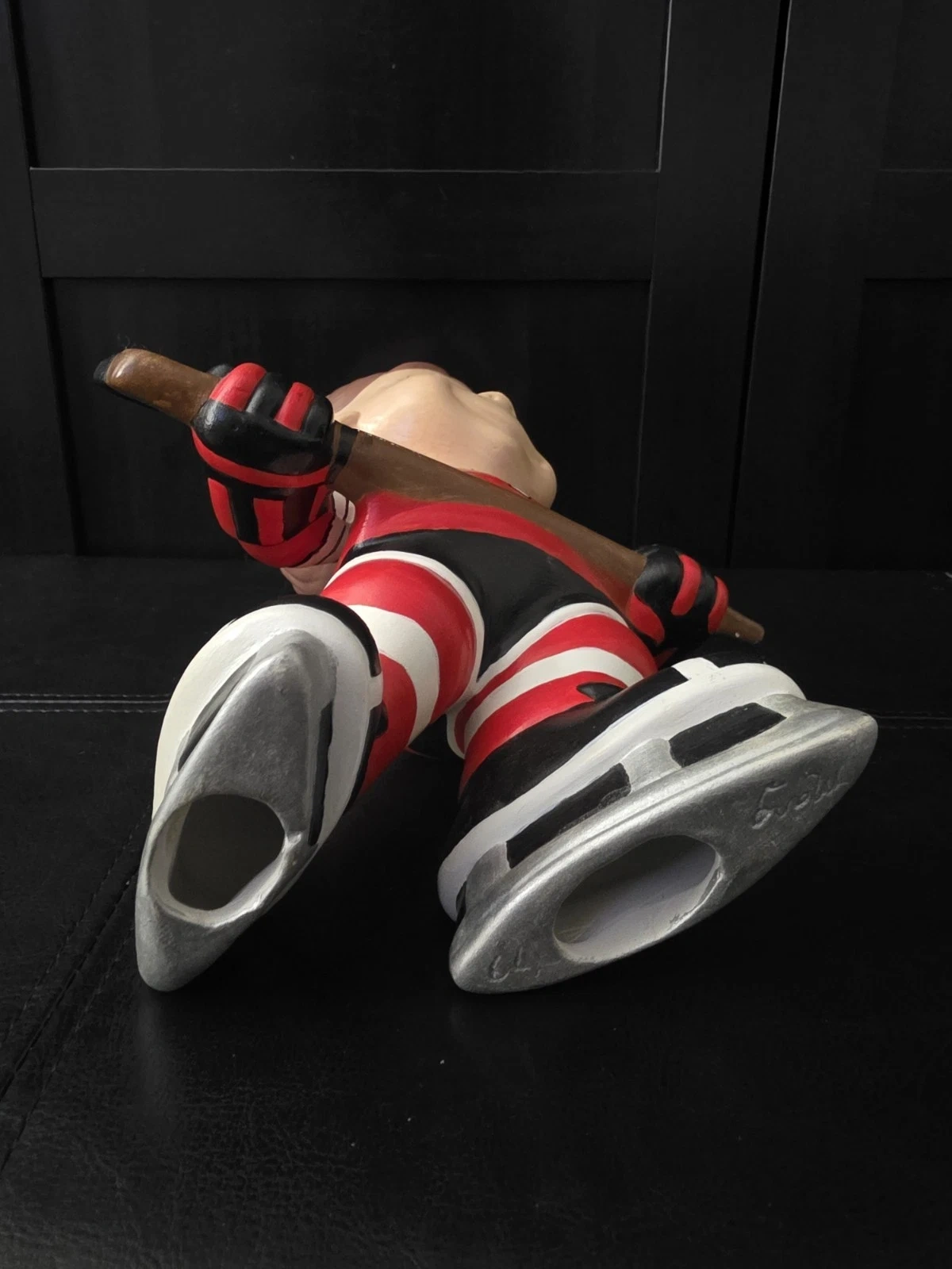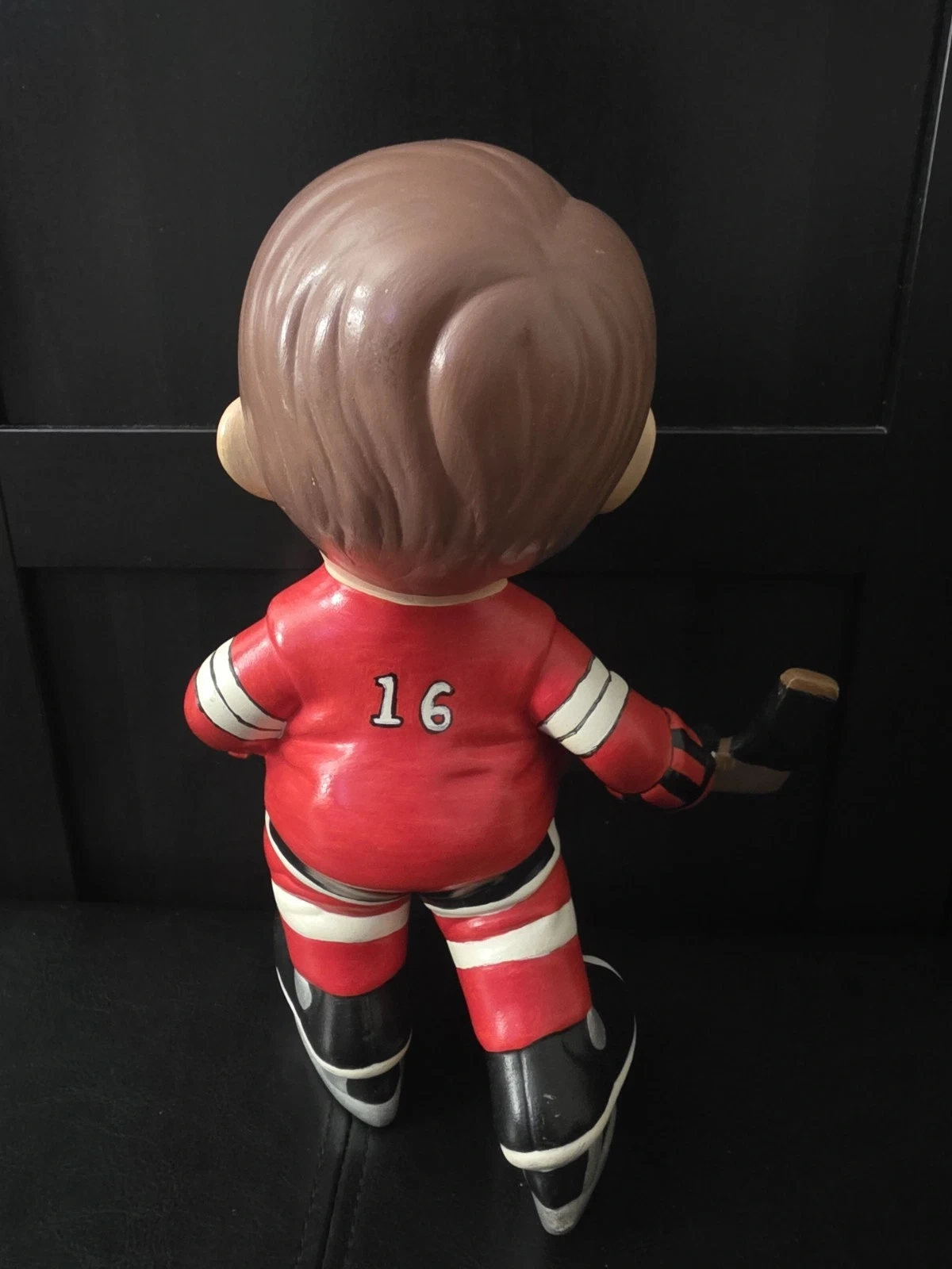 Used ceramic hockey player figurine from Atlantic Mold. Features red, white, and black colors. Handmade in the United States during the 1970s. Item height is 10.5 inches.