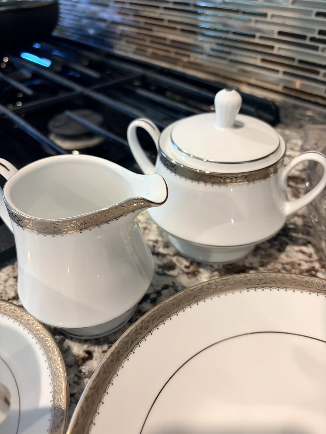Selling a beautiful Noritake Essex Platinum fine china set! This set includes plates, a creamer, and a sugar bowl. The china is white with a platinum trim. It's in great condition and ready to elevate your dining experience.