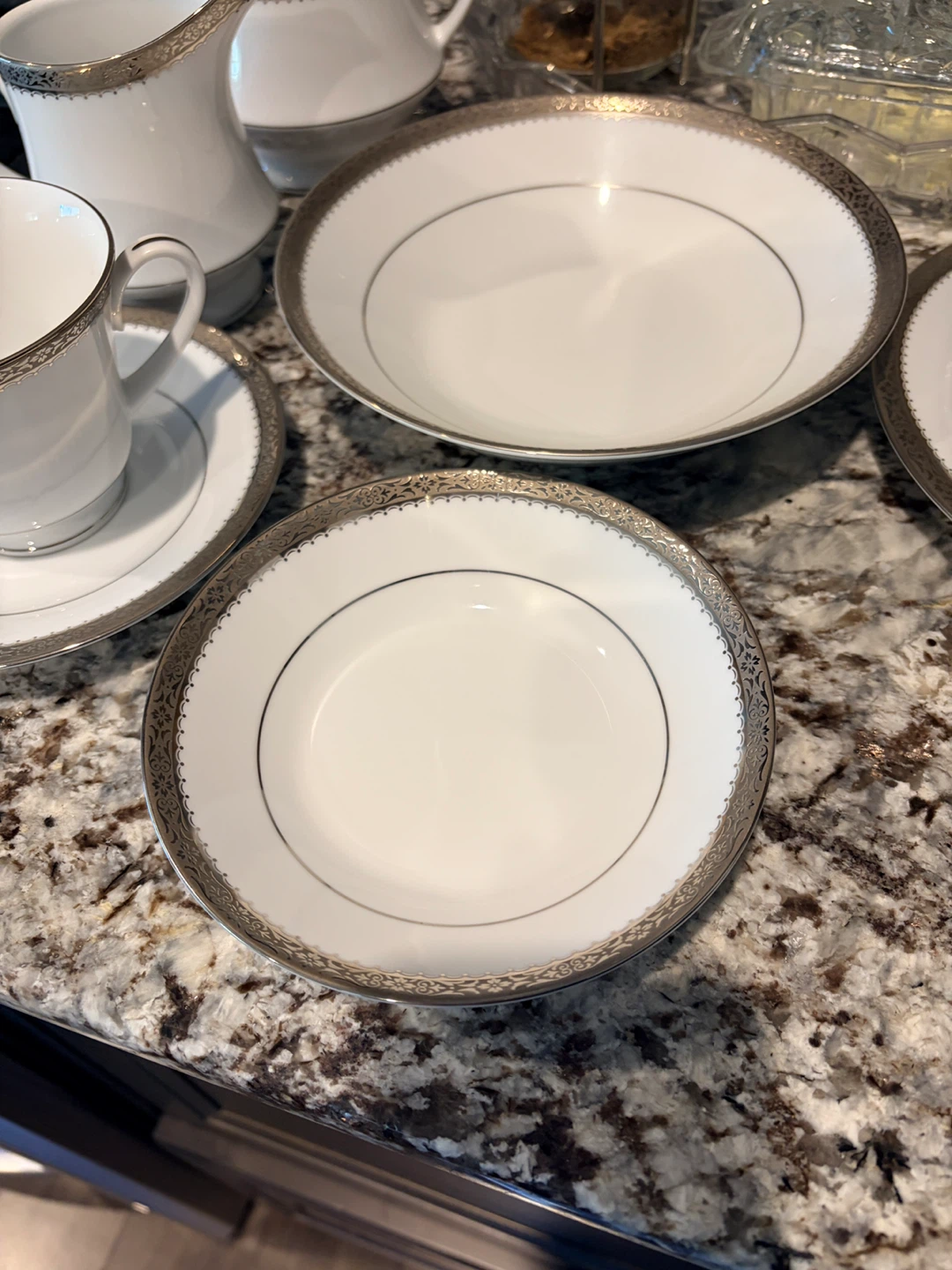 Selling a beautiful Noritake Essex Platinum fine china set! This set includes plates, a creamer, and a sugar bowl. The china is white with a platinum trim. It's in great condition and ready to elevate your dining experience.