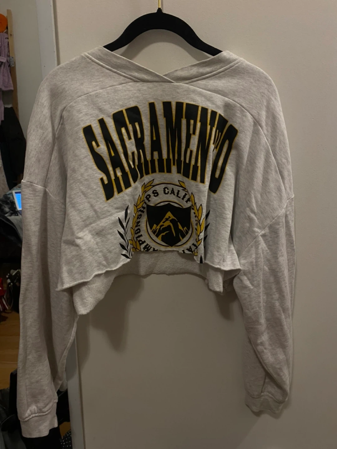 This is a grey cropped sweatshirt from Divided by H&M. It features a "Sacramento" graphic print on the back. Size large.