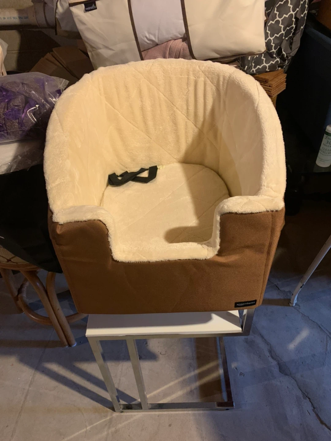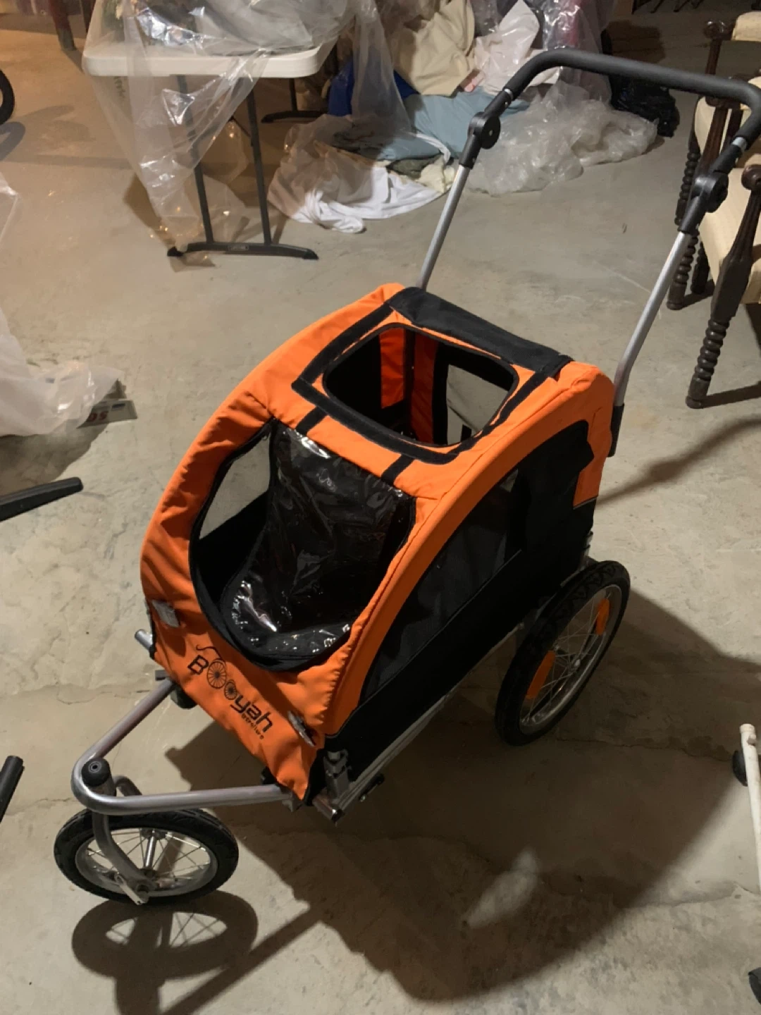 This orange and black pet trailer is from BOOYAH. It has large spoked wheels and a fabric canopy. It's designed for transporting pets.