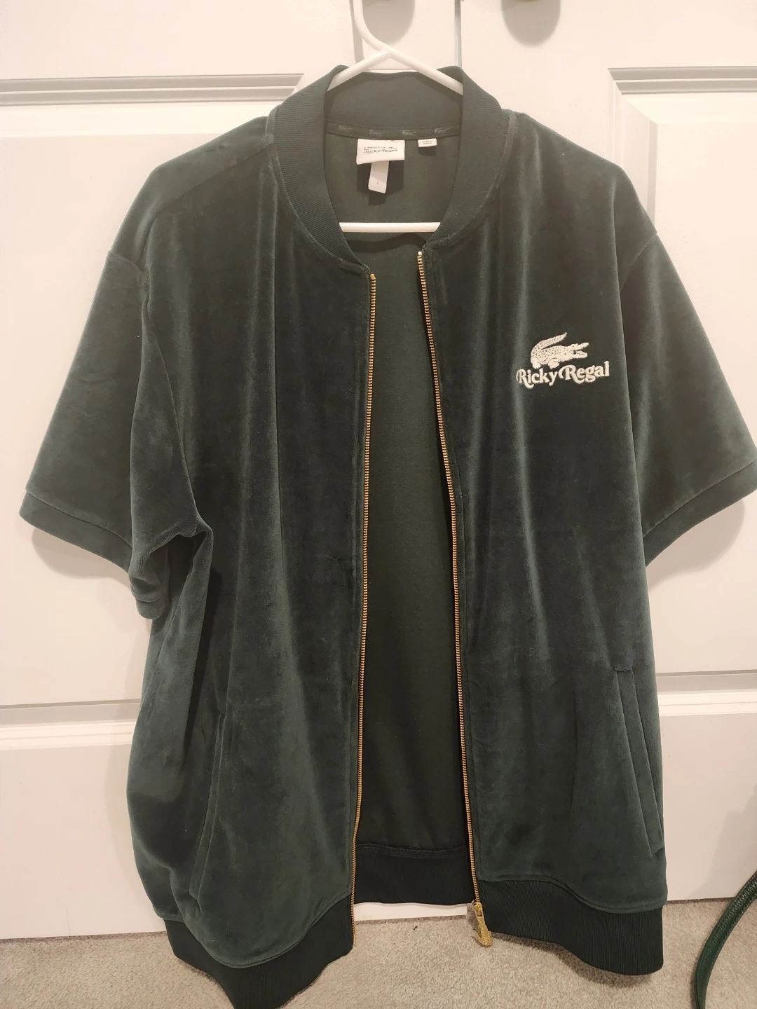 This short-sleeve velour bomber jacket is from the Ricky Regal x Lacoste collaboration. It's a stylish dark green colour with a gold zipper and features the iconic crocodile logo. It's a great piece for layering or as a statement jacket.