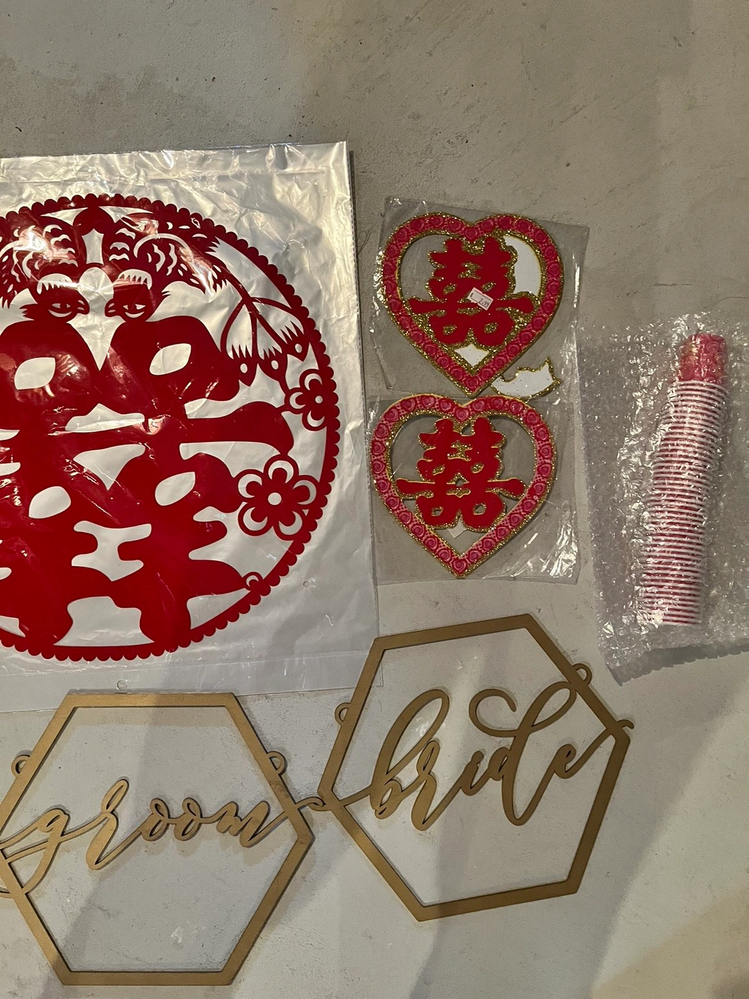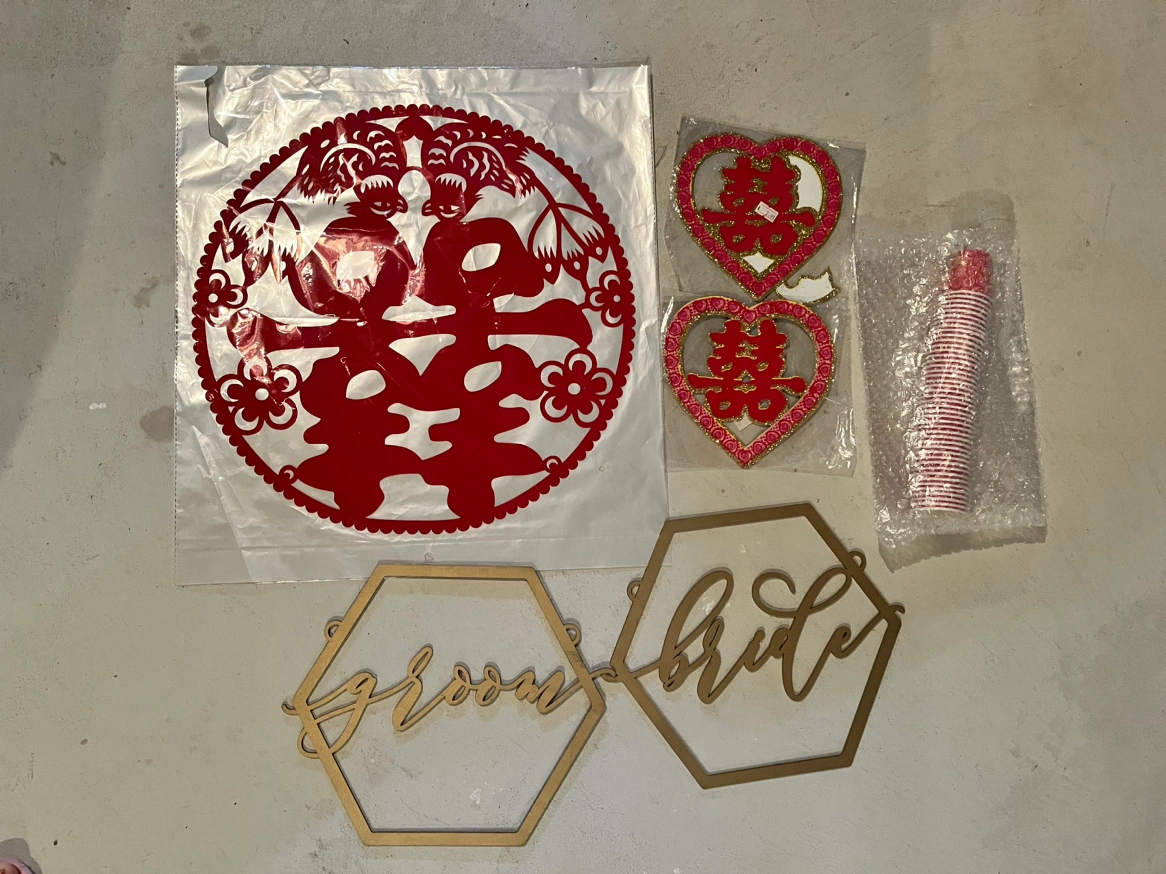 - 3 small double happiness heart signs with some glitter (1 used, 2 new)