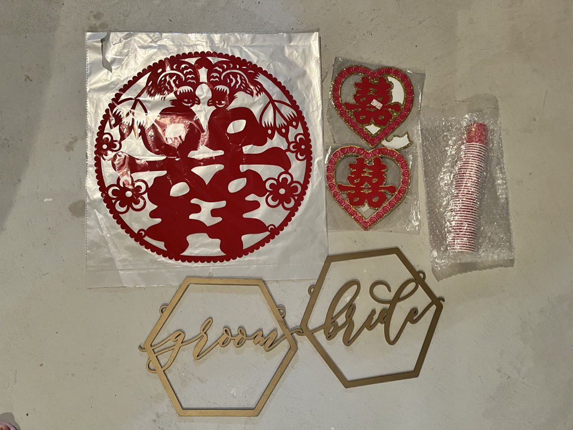 - 3 small double happiness heart signs with some glitter (1 used, 2 new)