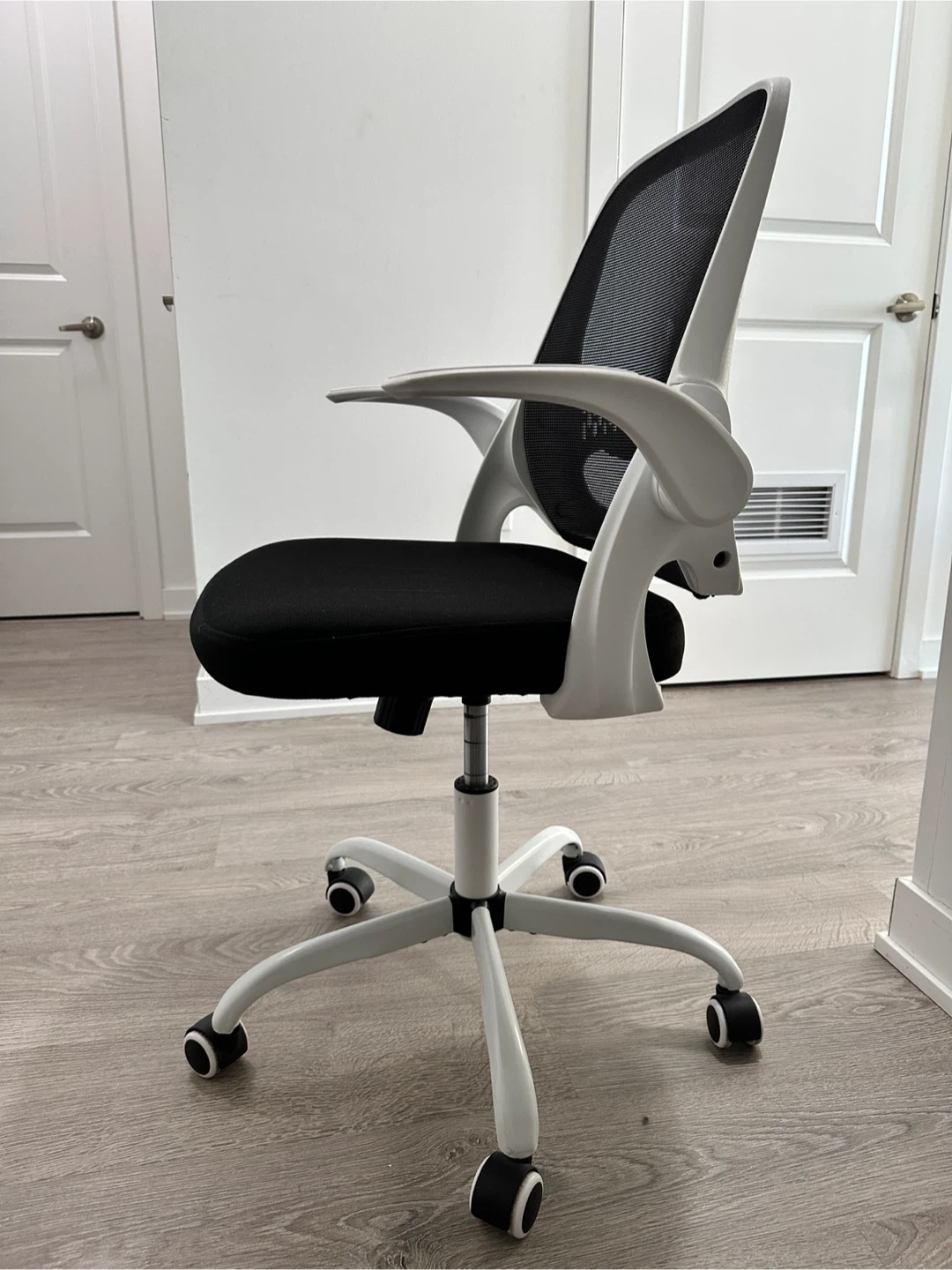 This office chair features a breathable black mesh back and a comfortable padded seat. It has adjustable armrests and a sturdy white base with wheels for easy mobility. Great for a home office setup!