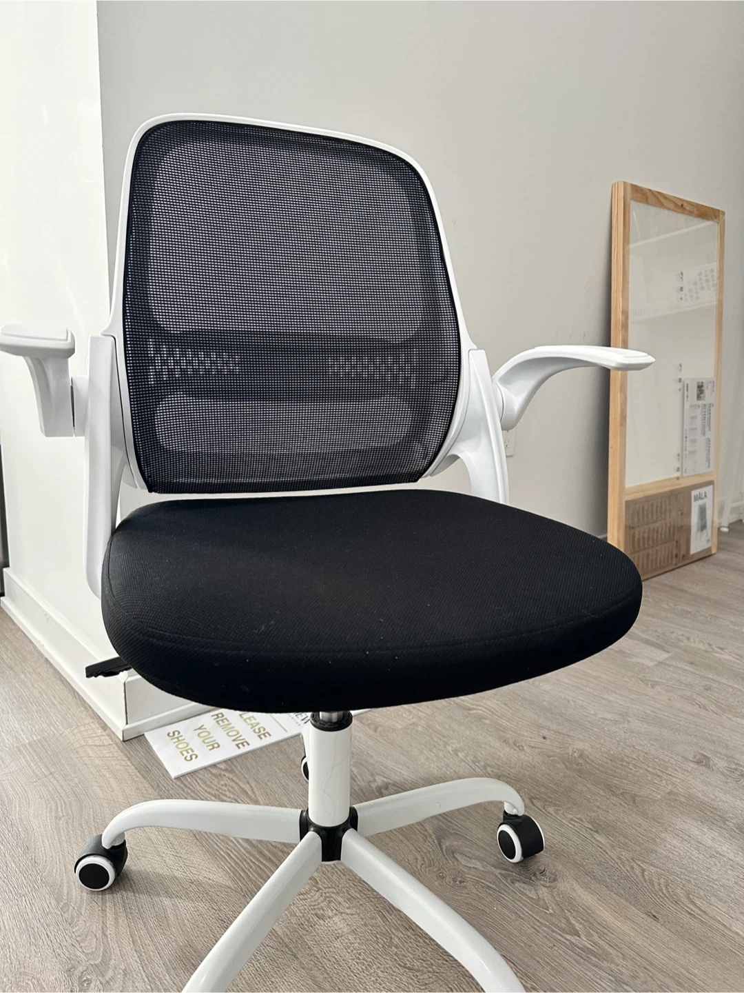 This office chair features a breathable black mesh back and a comfortable padded seat. It has adjustable armrests and a sturdy white base with wheels for easy mobility. Great for a home office setup!