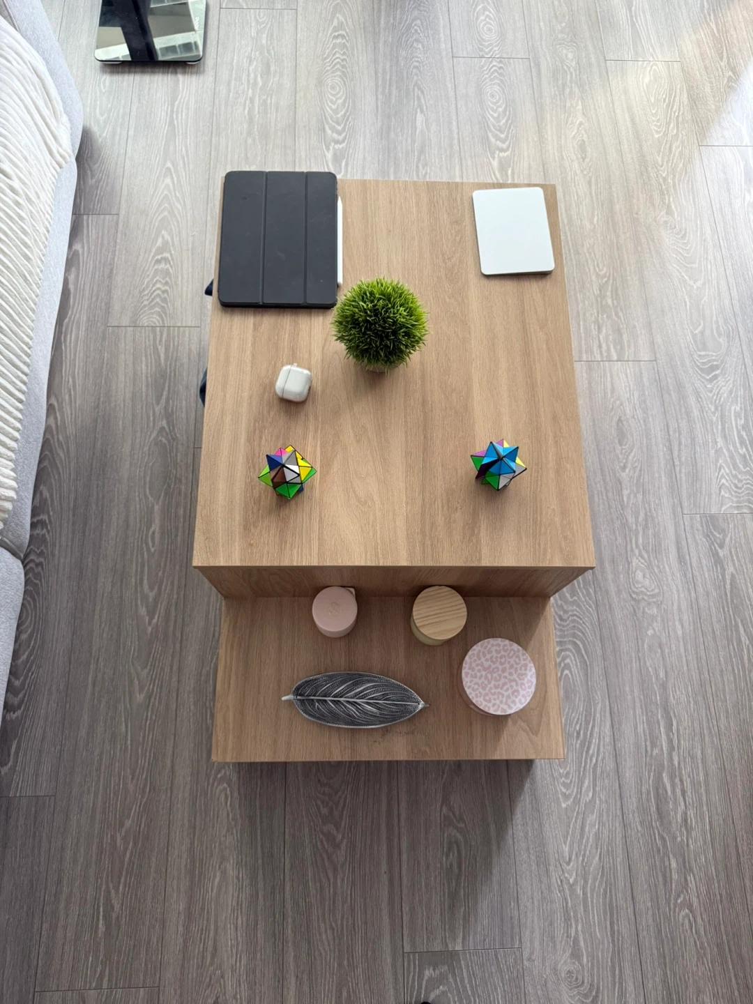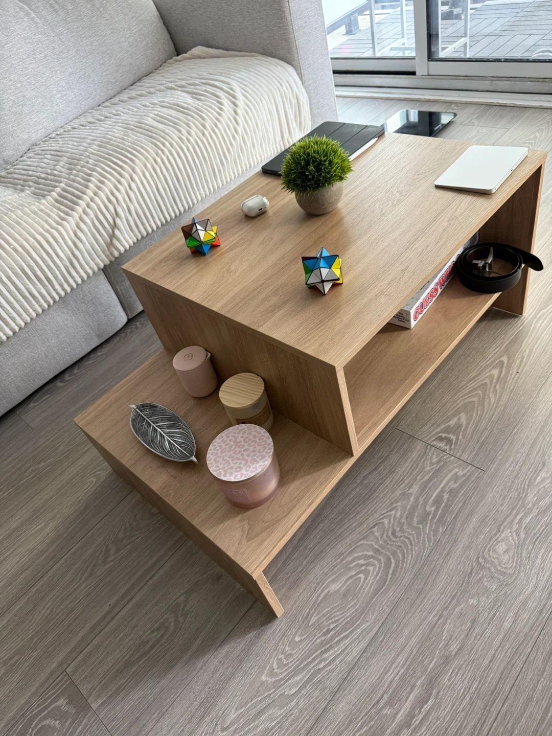 This is a modern coffee table with a unique layered design. It features a durable oak finish and offers ample surface area. Great for placing decor or everyday items!