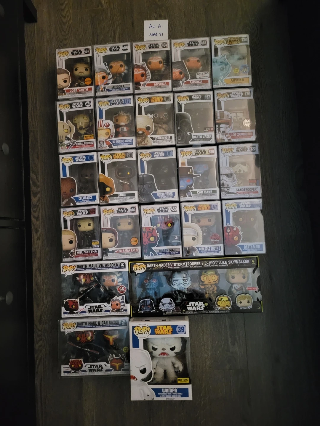 Collection of Funko Pop! vinyl figures from the Star Wars universe. Includes popular characters like Darth Vader, Ahsoka, and Wampa. These are collectible figures for fans of the franchise.