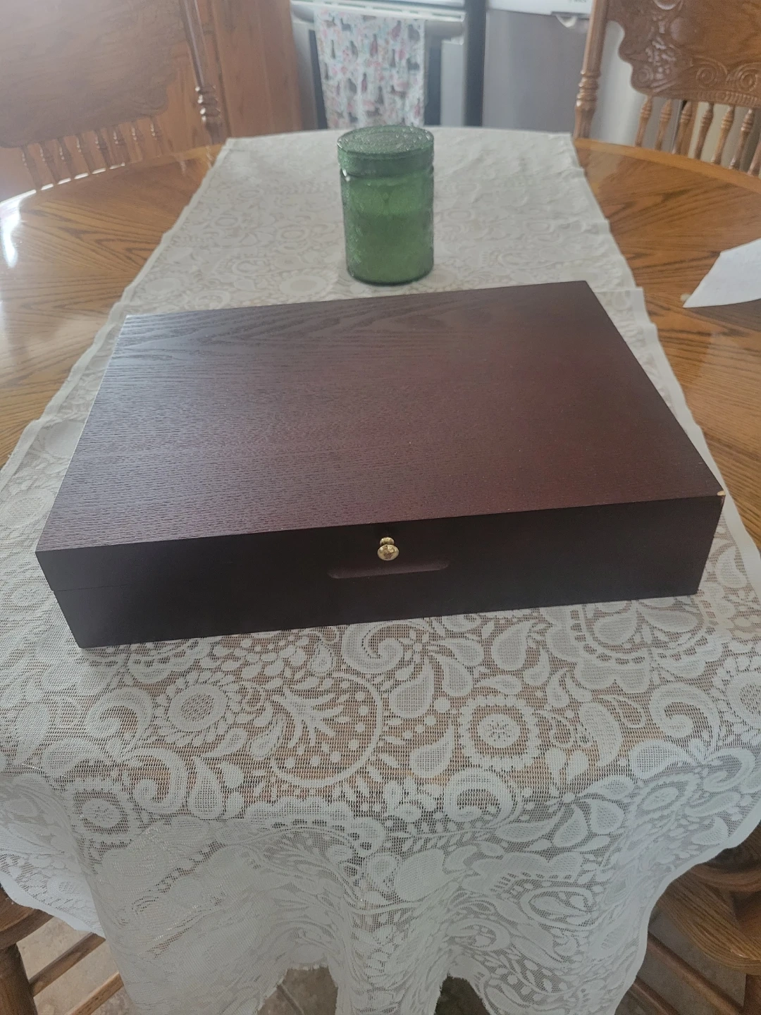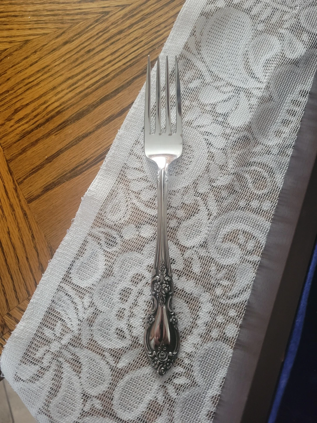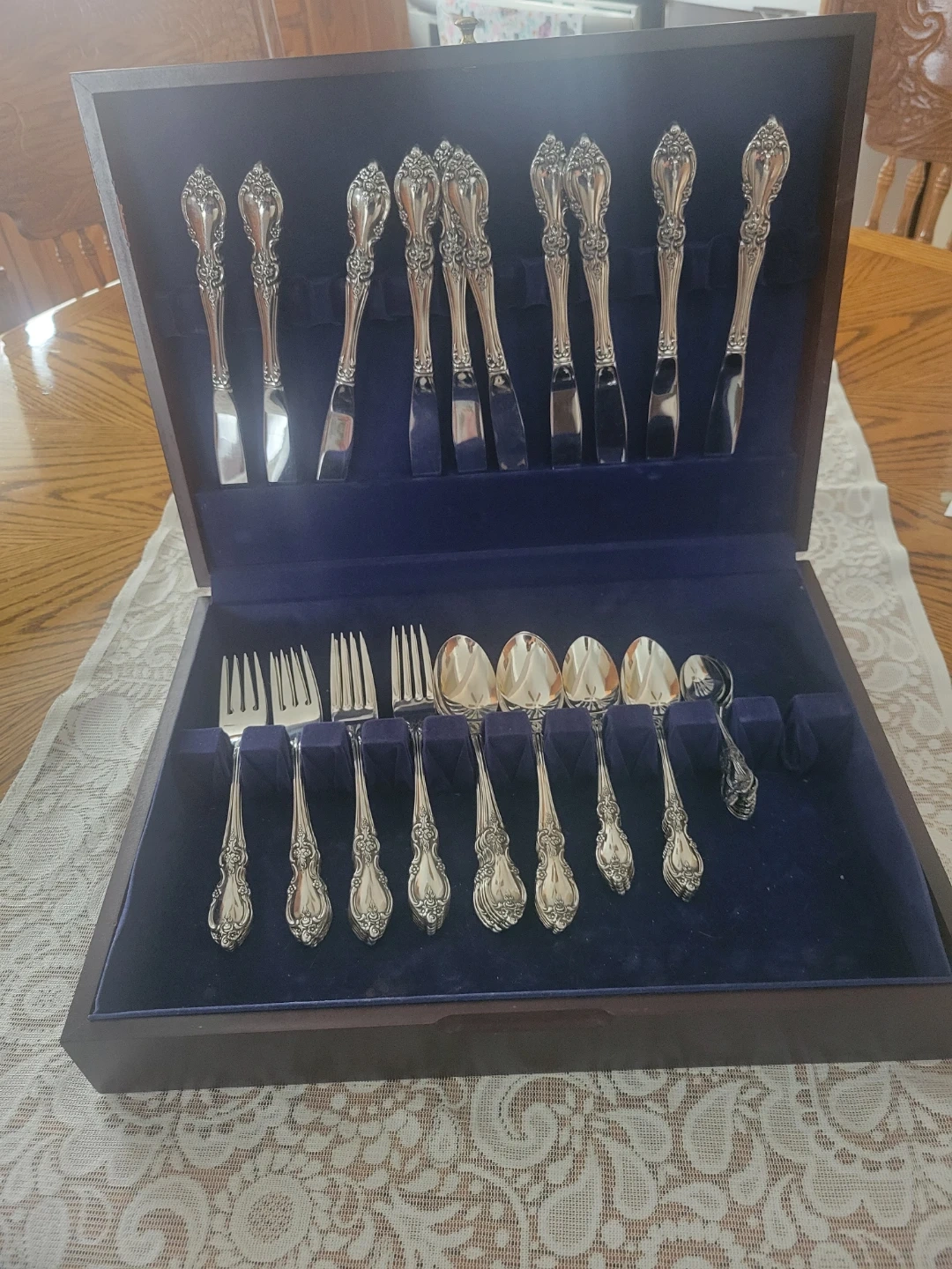 Oneida Community Stainless flatware, perfect for adding a touch of elegance to your dining experience, though it shows some signs of use. The set includes service for 10 with dinner forks, salad forks, spoons, knives, and teaspoons, all neatly stored in a wooden case. This set has been well cared for and is ready to be part of your family's meals for years to come.
