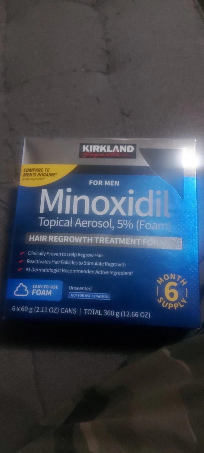 Selling a 6-month supply of Kirkland Minoxidil 5% Topical Aerosol (Foam) for men. This hair regrowth treatment is clinically proven to help regrow hair and reactivates hair follicles to stimulate regrowth. It's also the #1 dermatologist recommended active ingredient. Each box contains 6 cans, each with 60g (2.11 oz), for a total of 360g (12.66 oz).