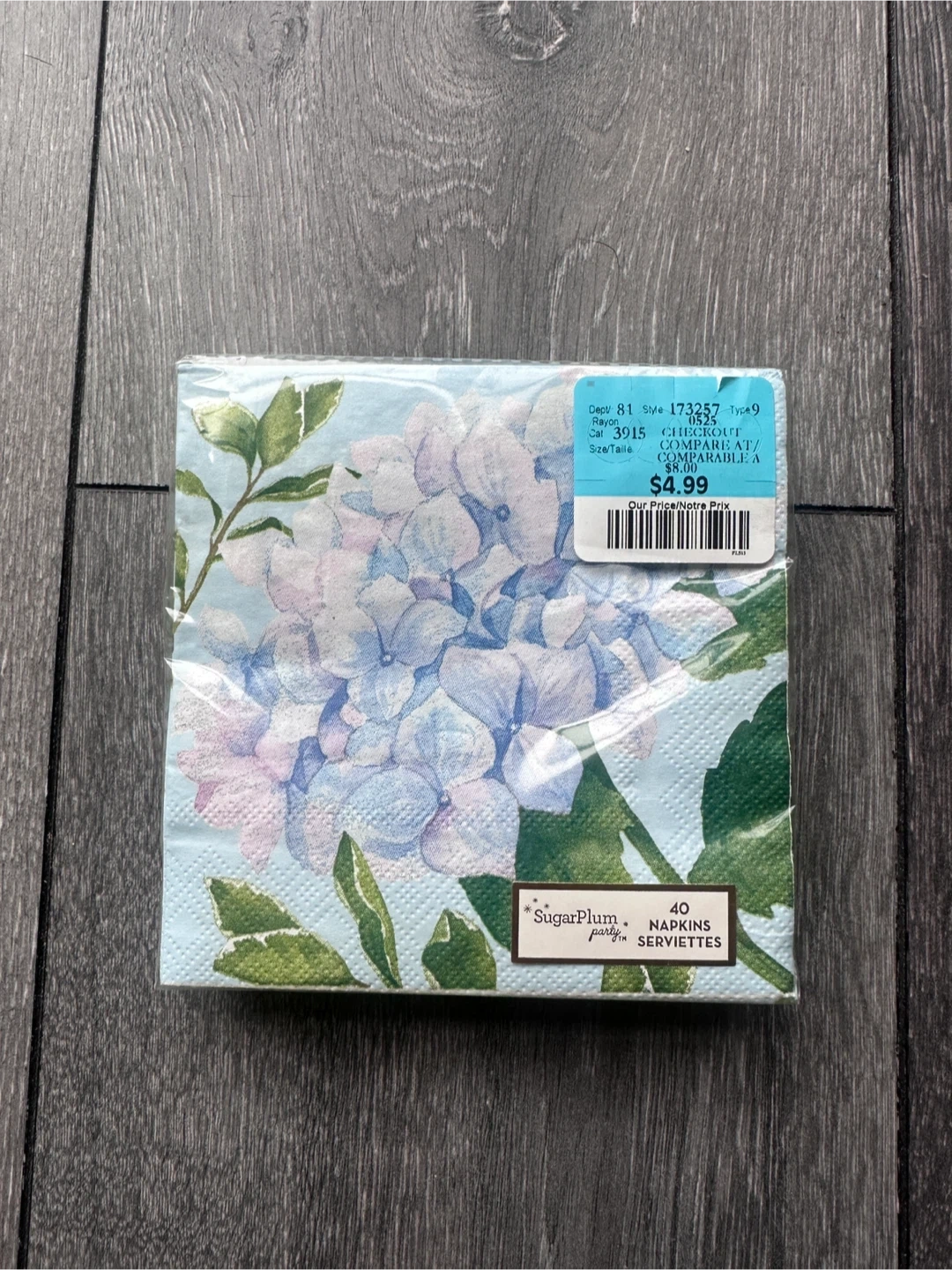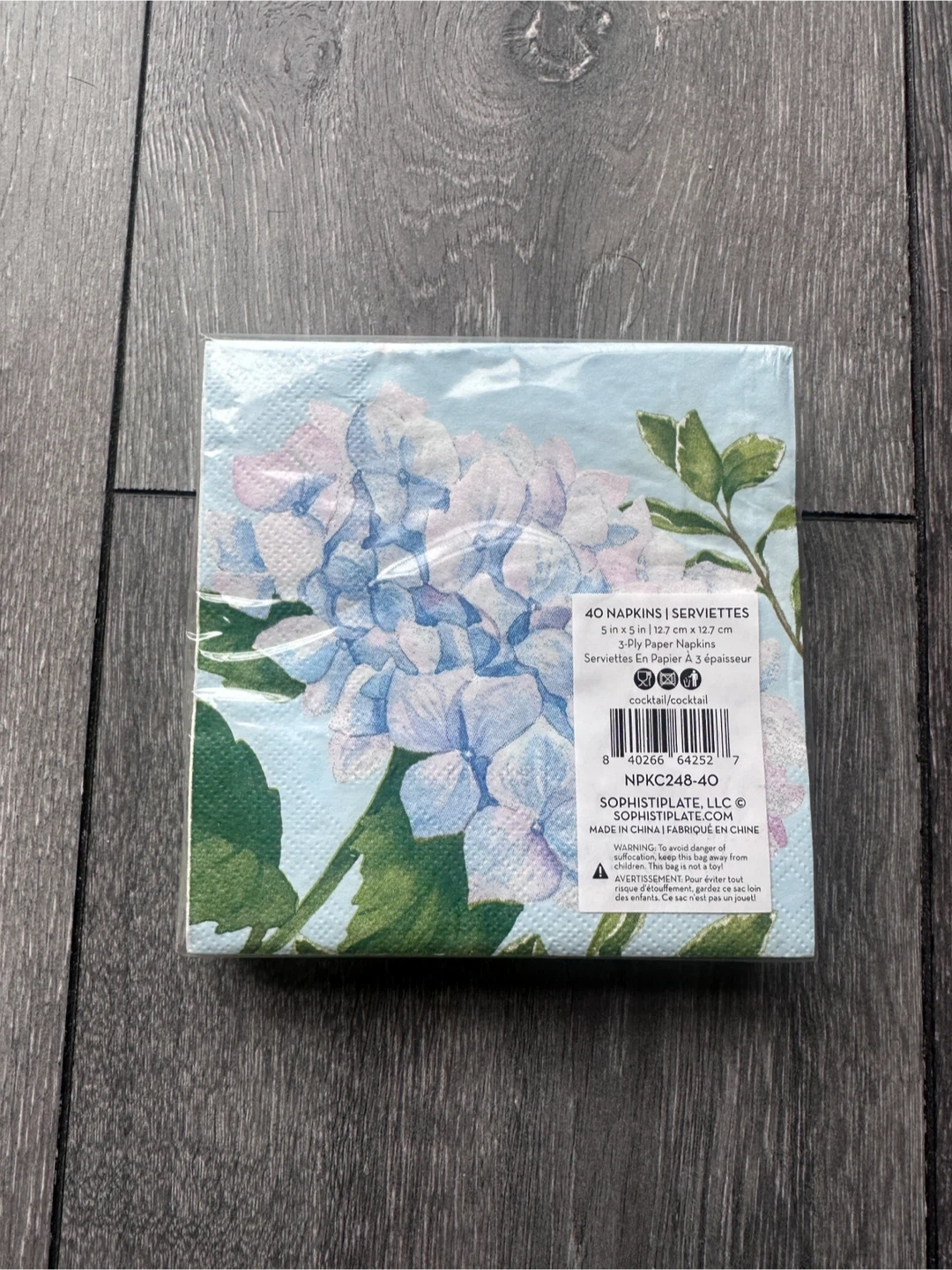 NEW SugarPlum Party cocktail napkins with a hydrangea floral design. Includes 40 3-ply paper napkins. Great for parties or everyday use! No stains/tears/holes, pet-free and smoke-free household. Pickup at 403 Church St, cash ONLY.