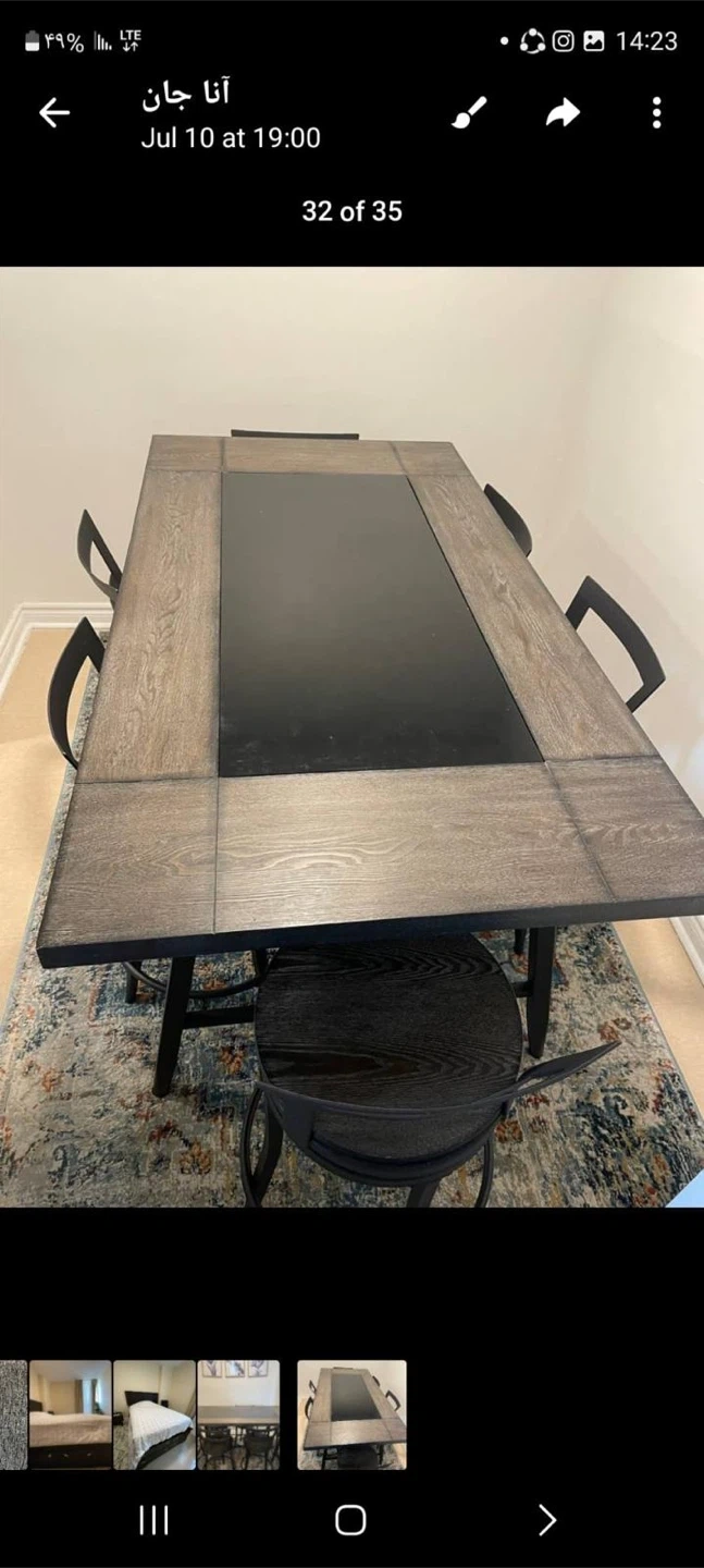 Set of four black metal bar stools with wooden seats. Includes a large dining table with a black centre and wooden border. This set is perfect for a dining room or kitchen island!