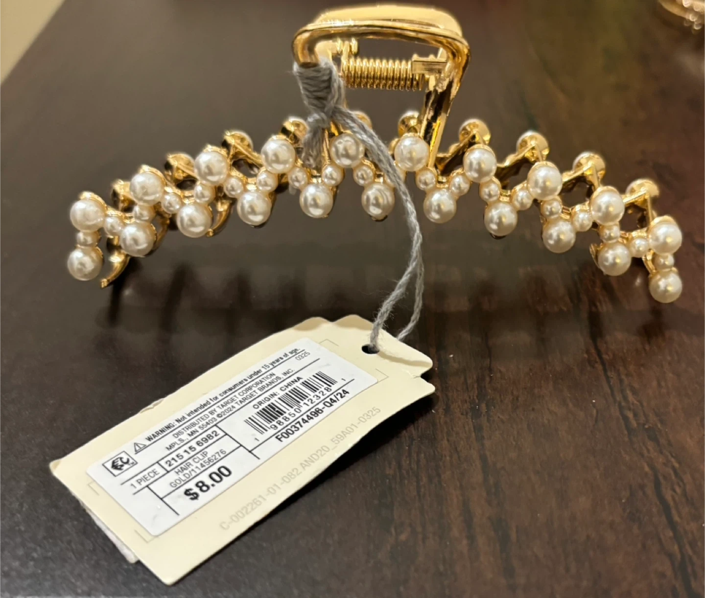 Decorative gold-tone hair claw clip with pearl accents. This clip is gold in color and features multiple small pearls. It's designed with an intricate pattern for a stylish look.