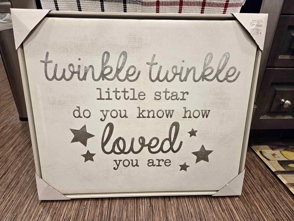Cute canvas wall art perfect for nursery or kids room. Has 'twinkle twinkle little star do you know how loved you are' message with glittery gray text and stars. White background. Still has corner protectors and tag. 25" across x 22" tall. Pick up in Niagara Falls.
