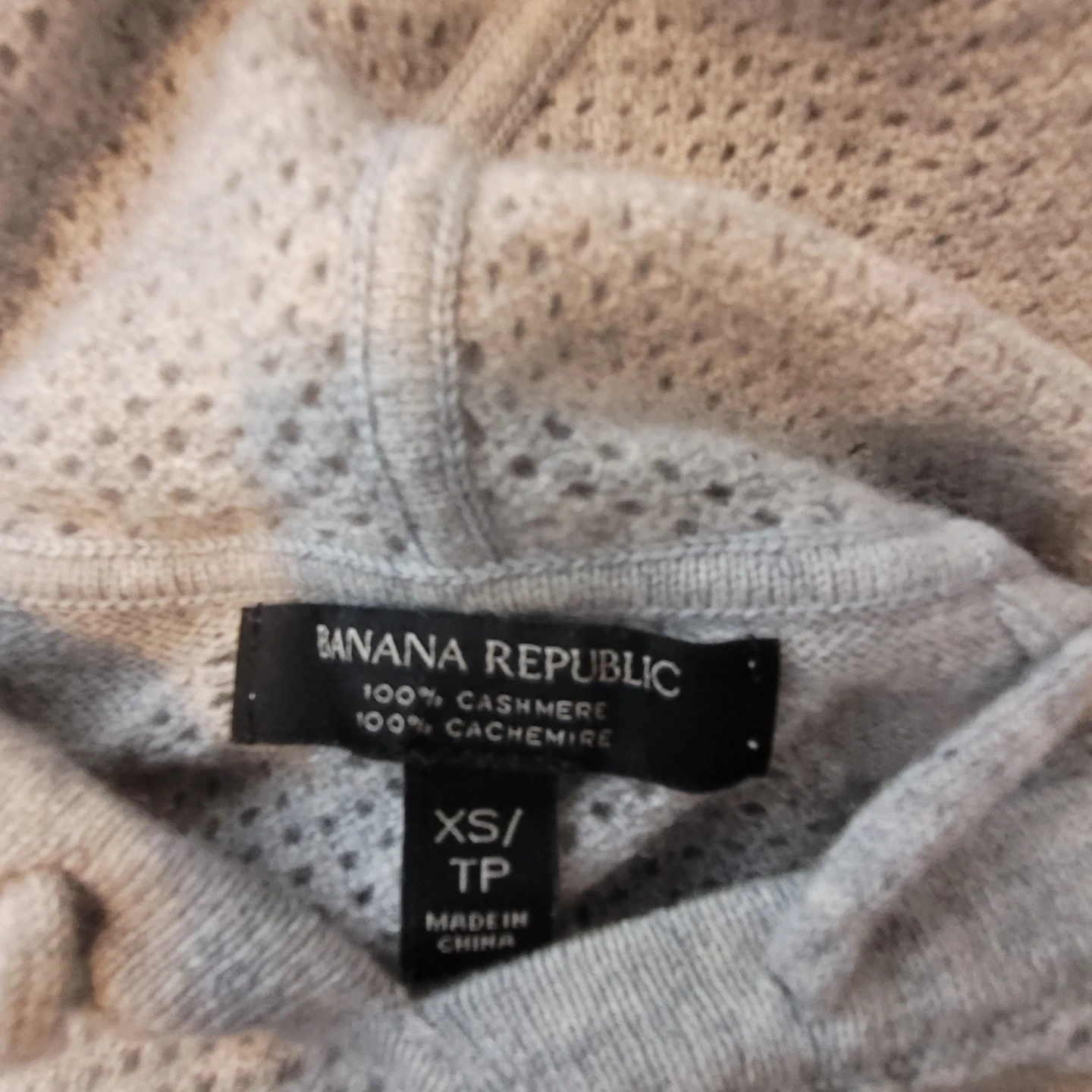 Banana Republic light grey hoodie. It's made of 100% cashmere. Size is XS/TP. It's a knit style with a drawstring hood.