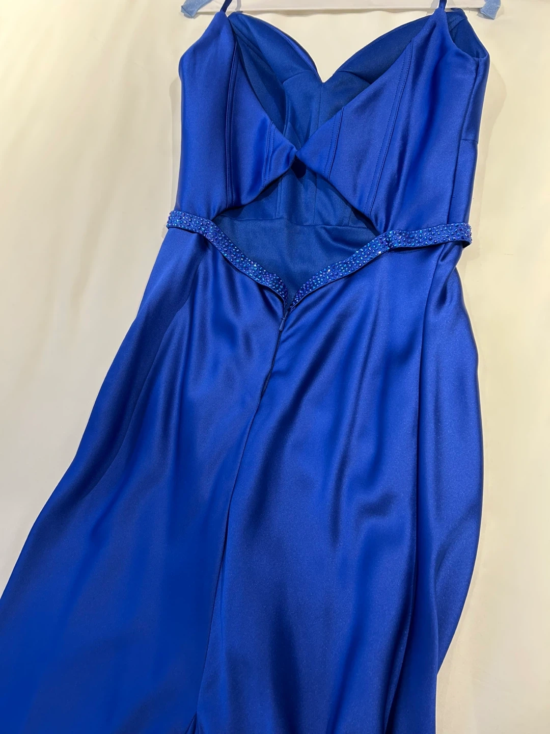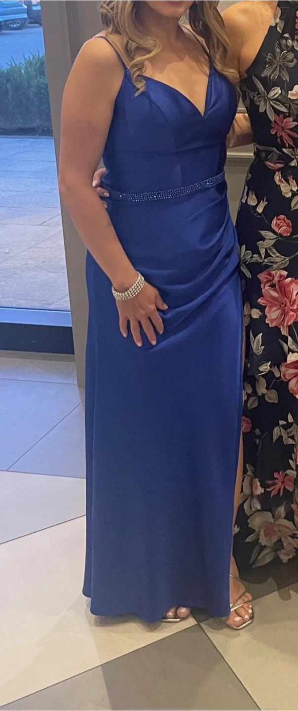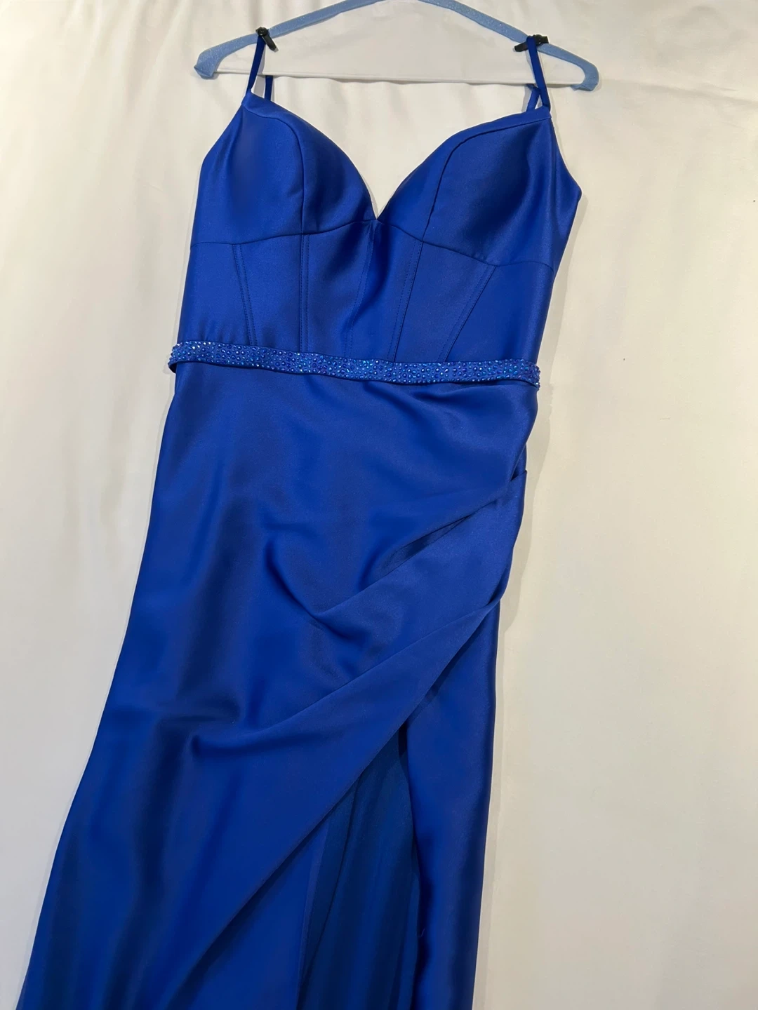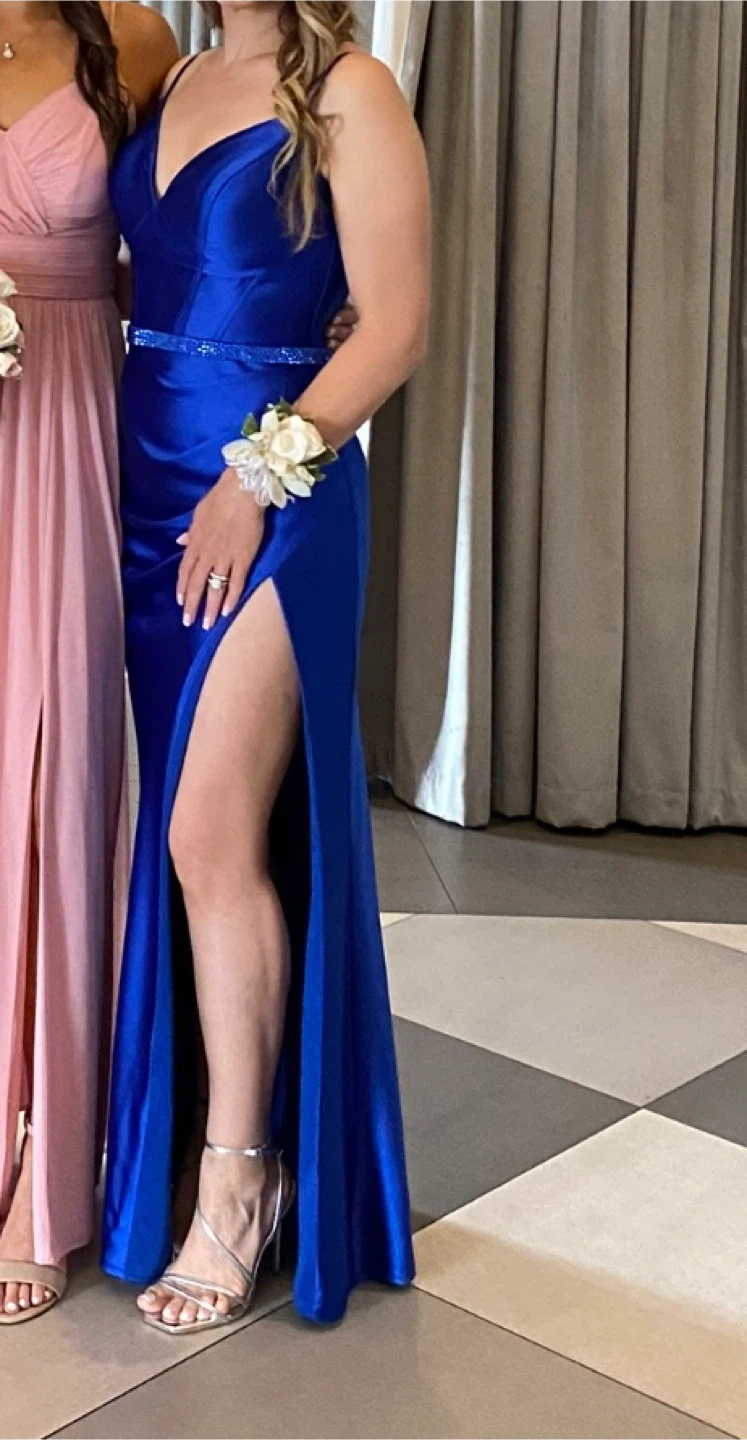Worn 1 time, this dress has been dry cleaned. Originally purchased for over $600 at Mona Richie boutique in Vaughan. Beautiful royal blue formal gown with a sweetheart neckline and a flattering silhouette. It features a sparkling beaded waistband and a thigh-high slit for added flair. This dress is perfect for proms, weddings, or any special occasion!