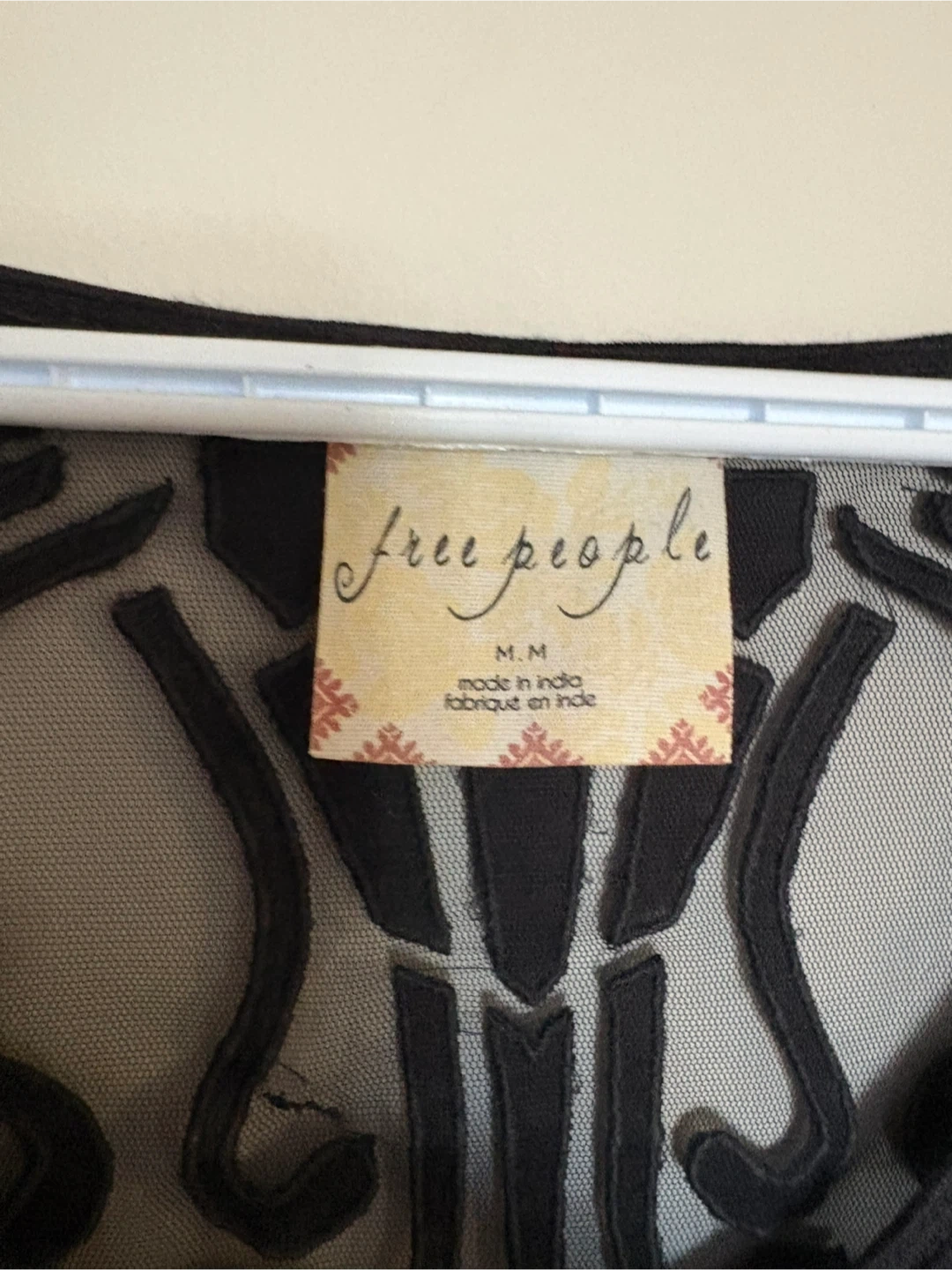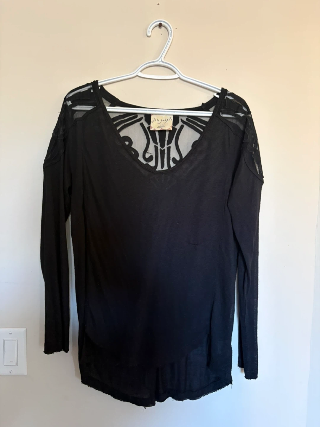 This is a black Free People long sleeve top with intricate lace detailing on the neckline and sleeves. It's made of a lightweight, sheer fabric. Size medium.
