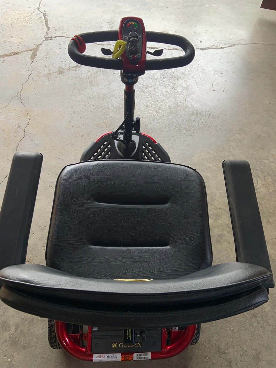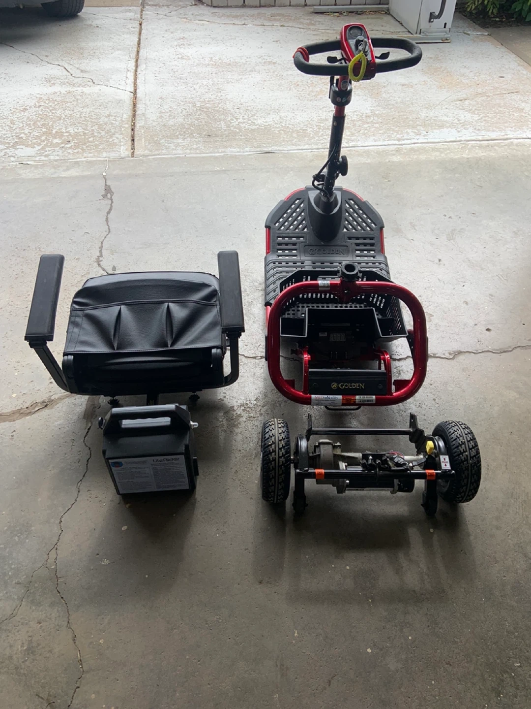 This Golden LiteRider mobility scooter is a reliable way to get around. It features a comfortable black seat and a red frame. Includes newer battery and is ready for use!