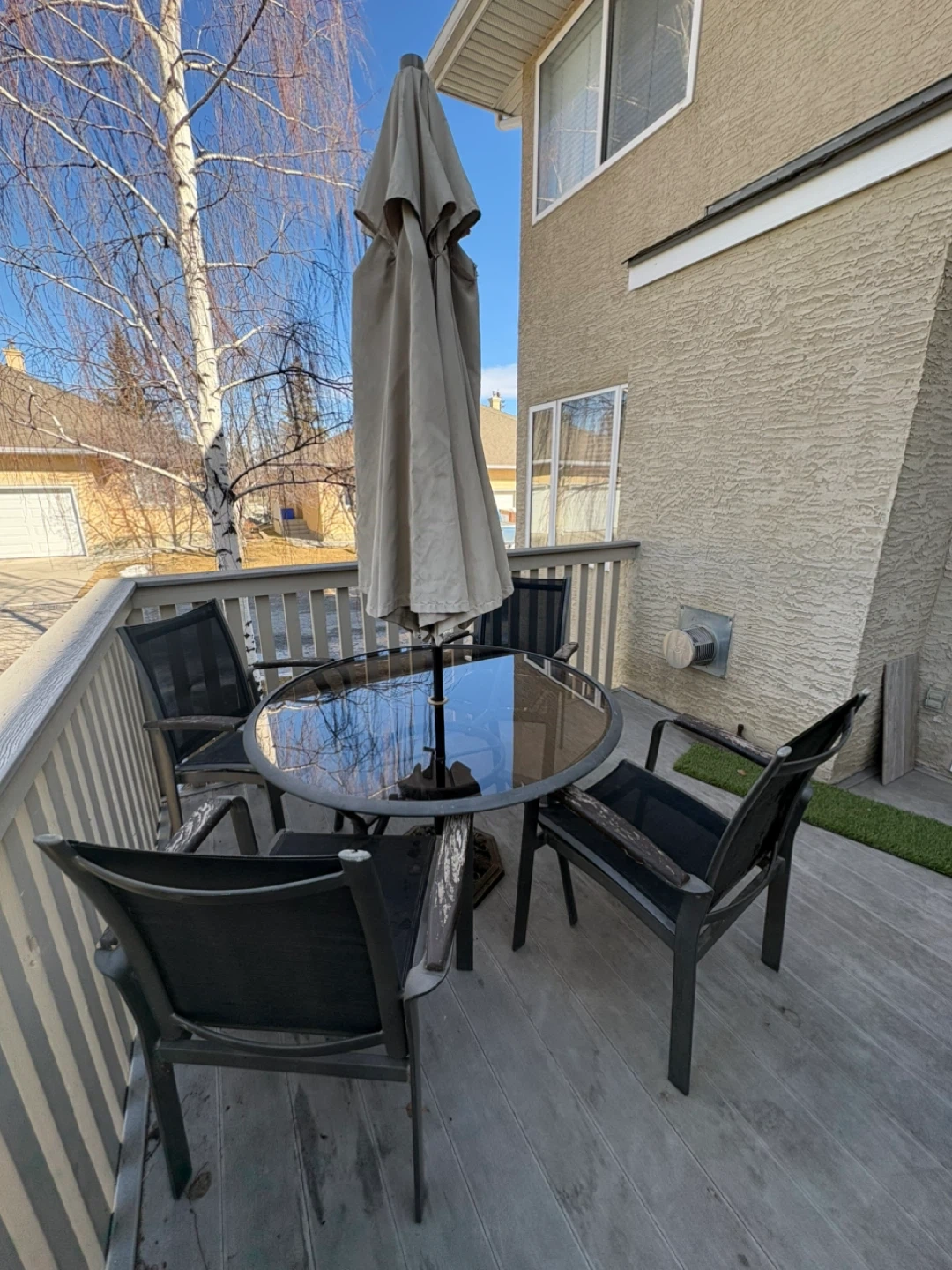 Round glass top patio table with four black mesh chairs and a large beige umbrella. Chairs have metal frames with wooden armrests. Umbrella fabric is slightly faded and needs manual raising. It stays up when angled. Needs repair but still functional. Table has a weighted, decorative metal base.