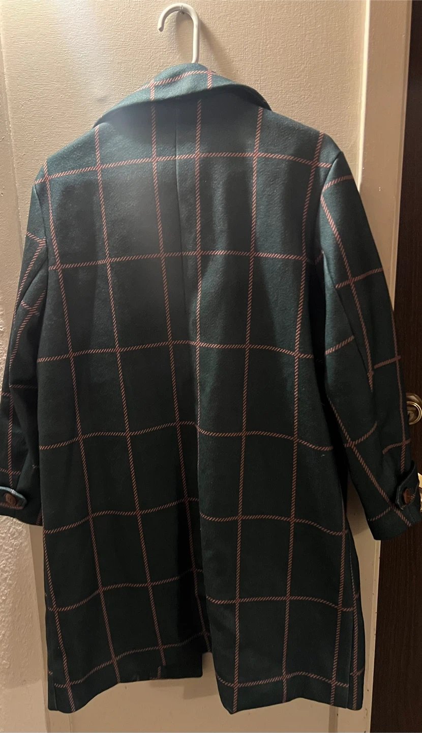 This stylish coat features a dark green base with a pink plaid pattern. It has a classic collar and button-front closure. The material feels like a wool blend. It's perfect for cooler weather! New never worn