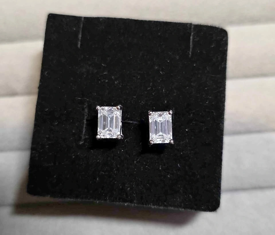 Brand new, rare rectangular moissanite stud earrings. D Color, VVS Clarity, Sterling Silver, Hypoallergenic, and Diamond Tester Passed. They sparkle like a diamond, perfect for everyday luxury, bridal gifts, or timeless elegance. Pickup in East Vancouver.