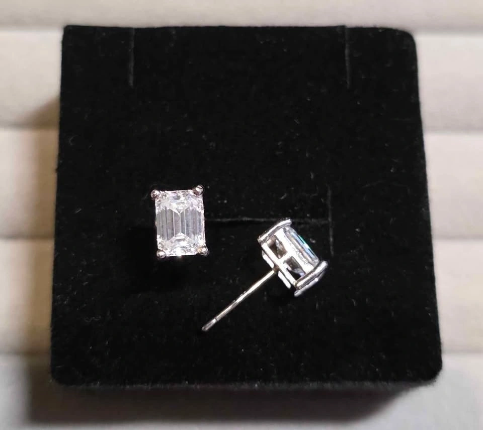 Brand new, rare rectangular moissanite stud earrings. D Color, VVS Clarity, Sterling Silver, Hypoallergenic, and Diamond Tester Passed. They sparkle like a diamond, perfect for everyday luxury, bridal gifts, or timeless elegance. Pickup in East Vancouver.