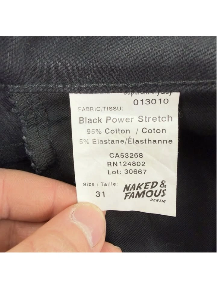 Naked & Famous Men's Size 30 W X 33 L Super Skinny Guy Black Power Stretch jeans in good pre-owned condition, as shown in the photos. No flaws. Made in Canada.