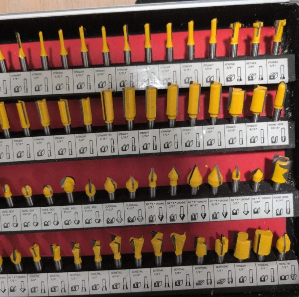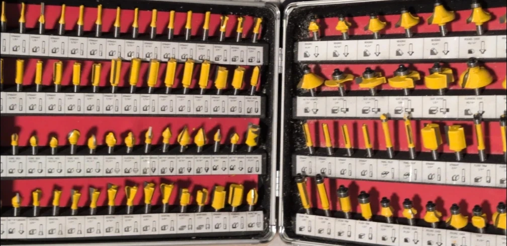 This is a 100-piece router bit set with various shapes and sizes. It includes straight bits, round over bits, flush trim bits, and more. All bits come in a durable carrying case for easy storage and transport.