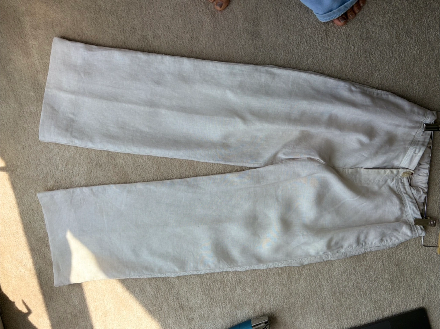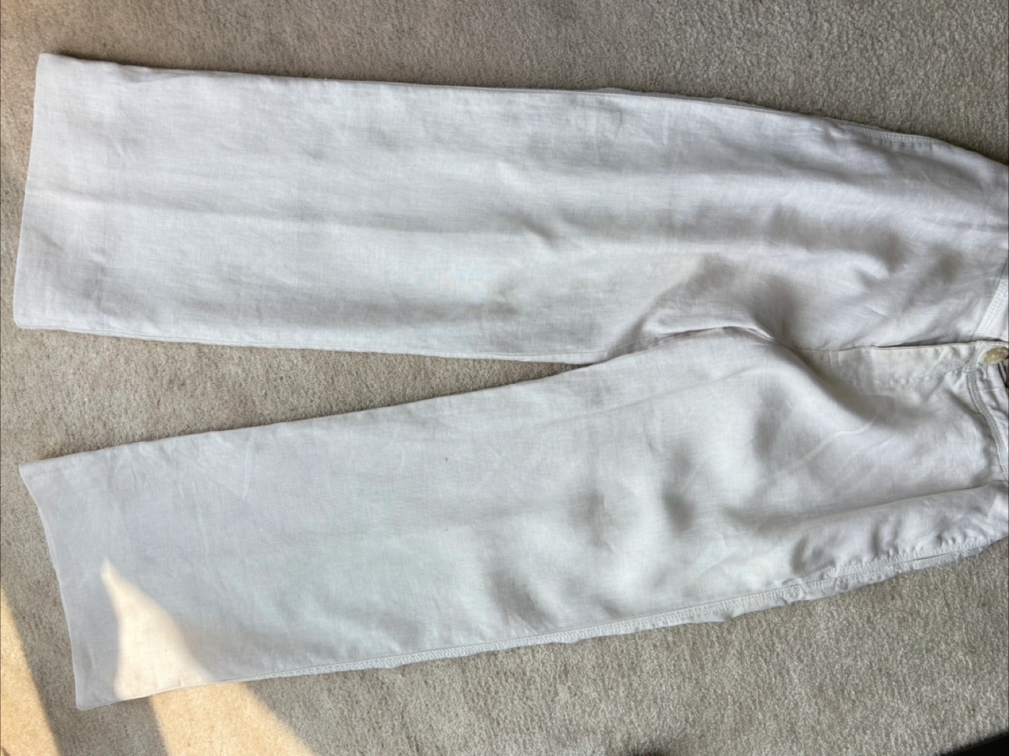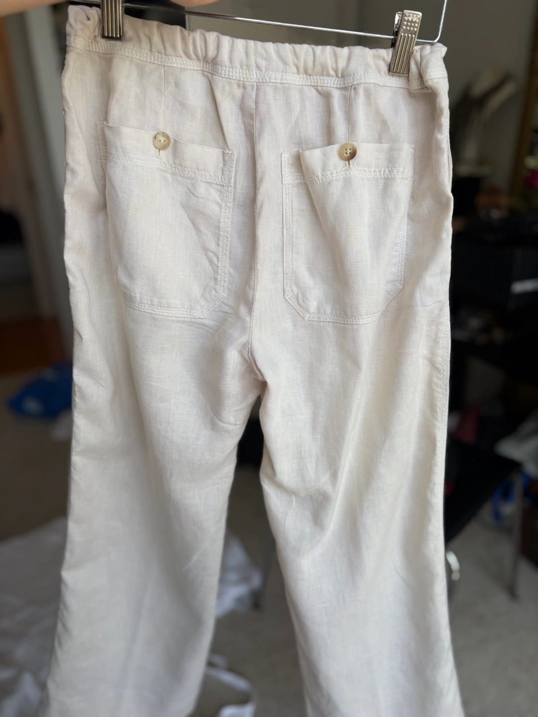 Cream coloured pants. Elastic waistband. Two front pockets. Two back pockets with button closure. These pants are very comfortable for a relaxed day.
