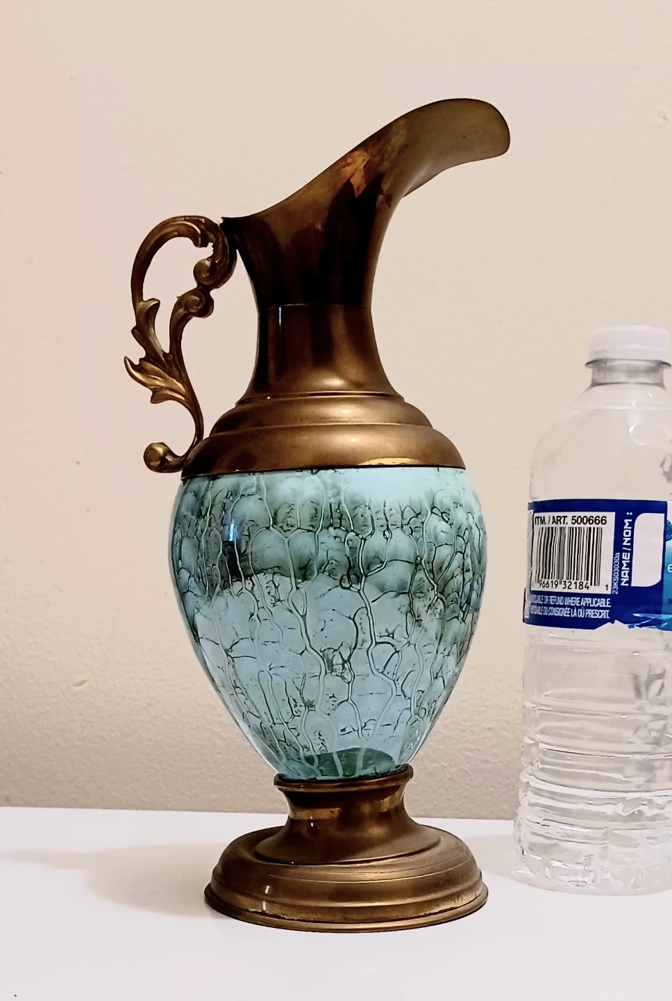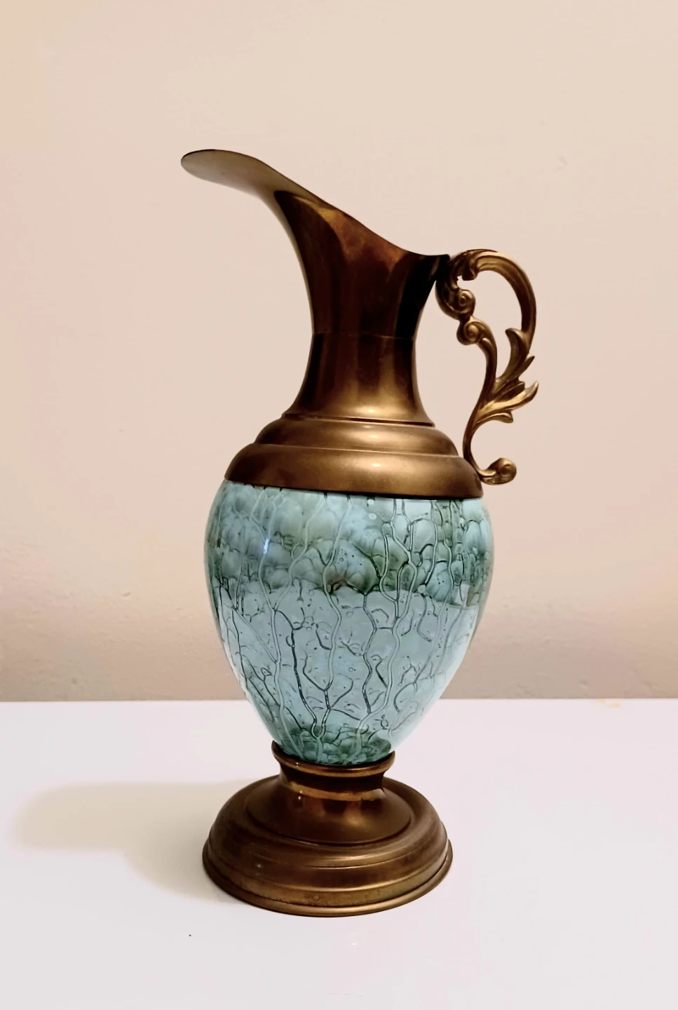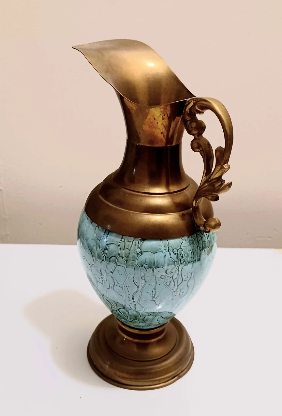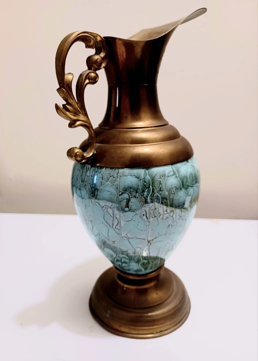 Elegant vintage 1960s brass pitcher features a unique marbled blue crackle glass design, perfect for adding a touch of antique charm to any space. Its ornate handle and classic shape make it a standout piece.