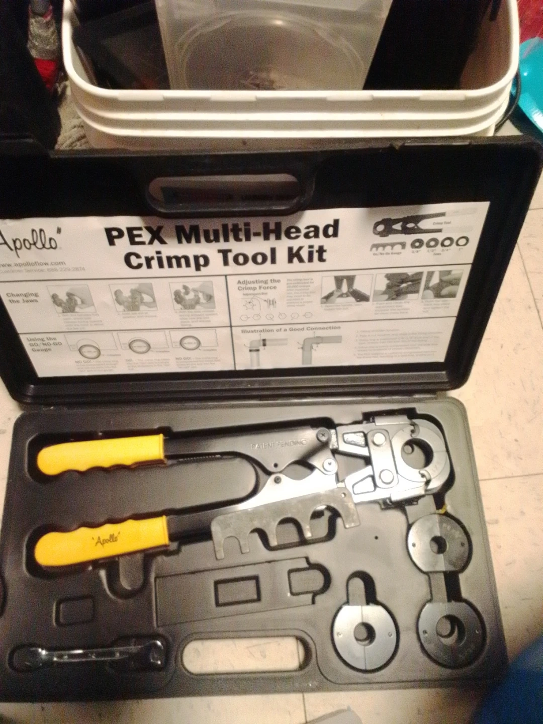 This is an Apollo PEX Multi-Head Crimp Tool Kit. It includes the main tool and several jaws for different fittings. Changing the jaws is straightforward for different PEX sizes.