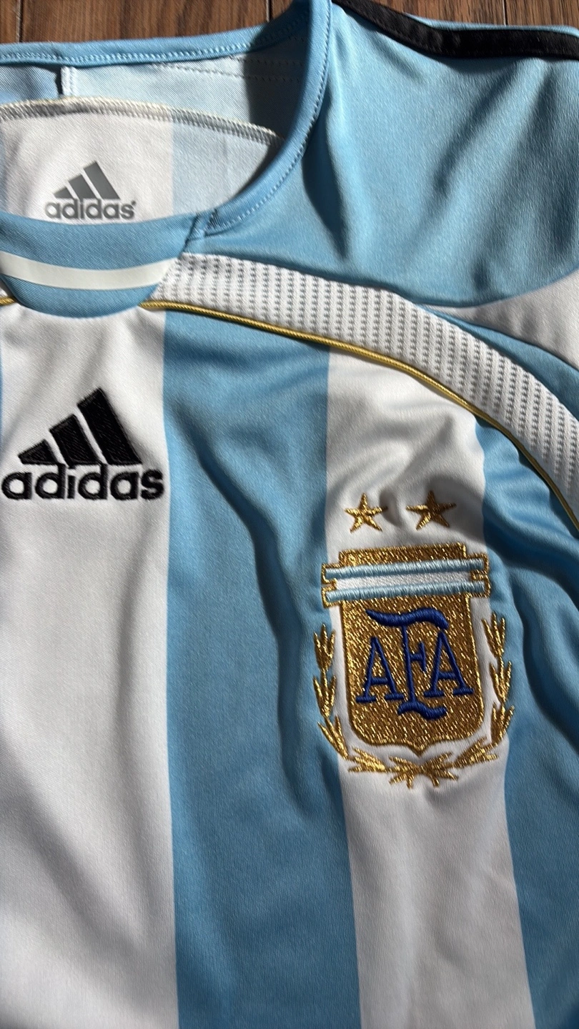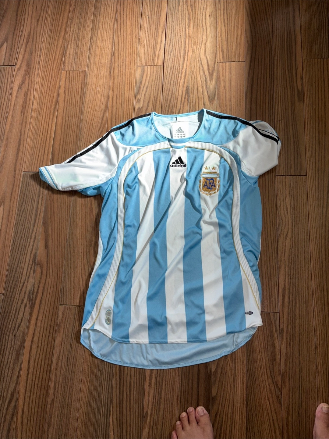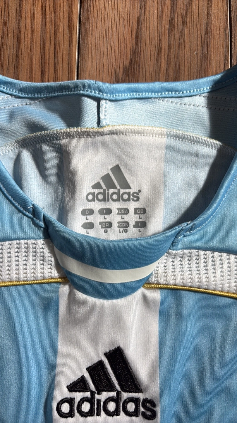Men's Adidas Argentina national team soccer jersey. Light blue and white vertical stripes. Adidas logo and Argentina crest. Size large.