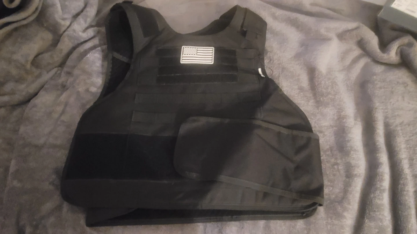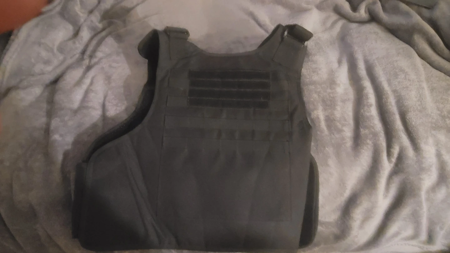 This black tactical vest features MOLLE webbing for customization. It has adjustable shoulder straps and a hook-and-loop front panel. It's designed for carrying gear and accessories.