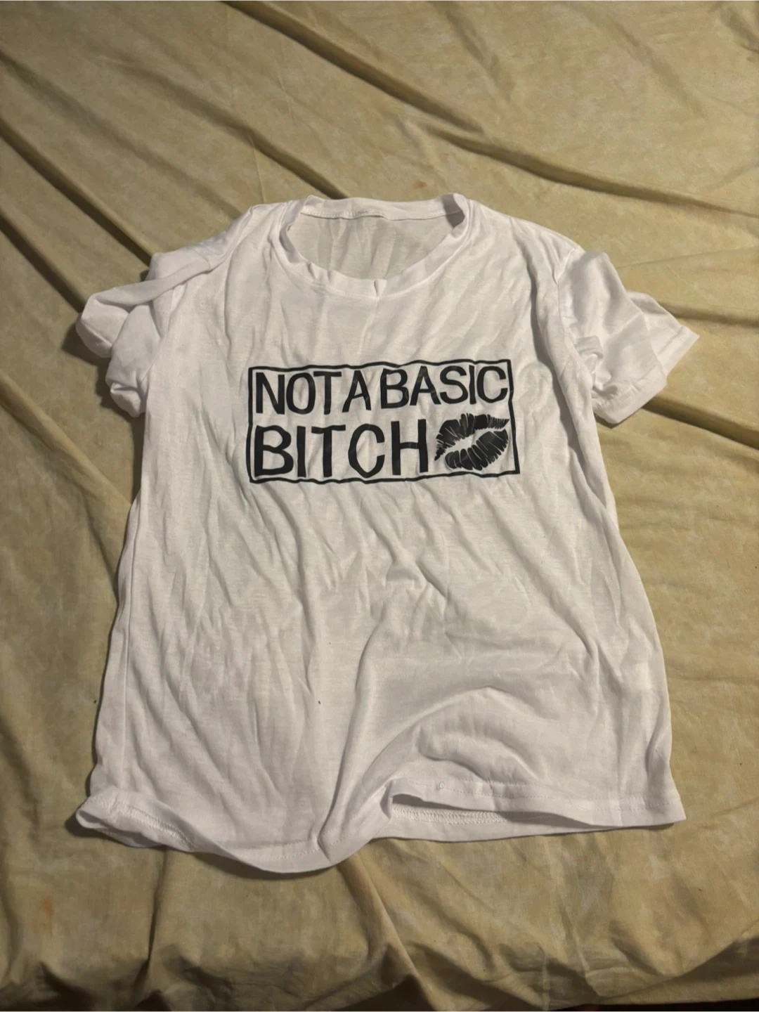 White t-shirt with "Not A Basic Bitch" graphic and a lipstick kiss imprint. It's made of a soft cotton blend for comfort. This tee is great for expressing your unique style!