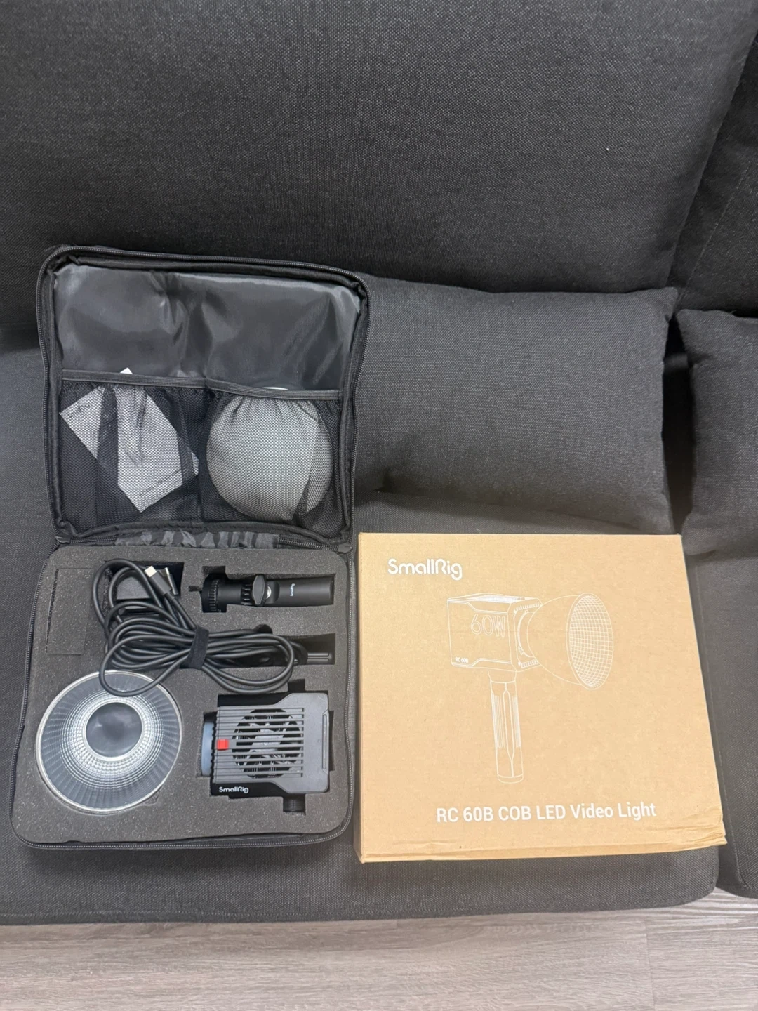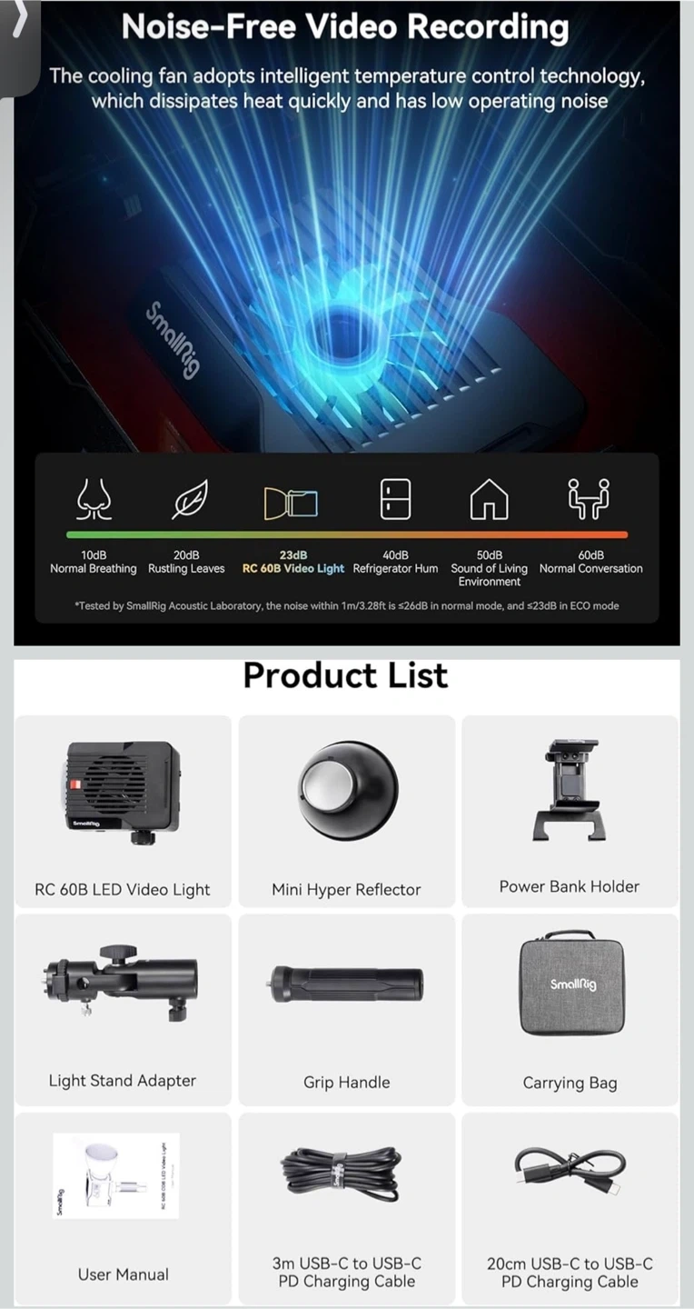 Package Includes: RC 60B LED Video Light x 1, mini Hyper Reflector x 1, 3m USB-C to USB-C PD Charging Cable x 1, Light Stand Adapter x 1, Grip Handle x 1, Protection Cover x 1, User Manual x1, Carrying Bag x1, Power Bank Holder x 1, 20cm USB-C to USB-C PD Charging Cable x 1