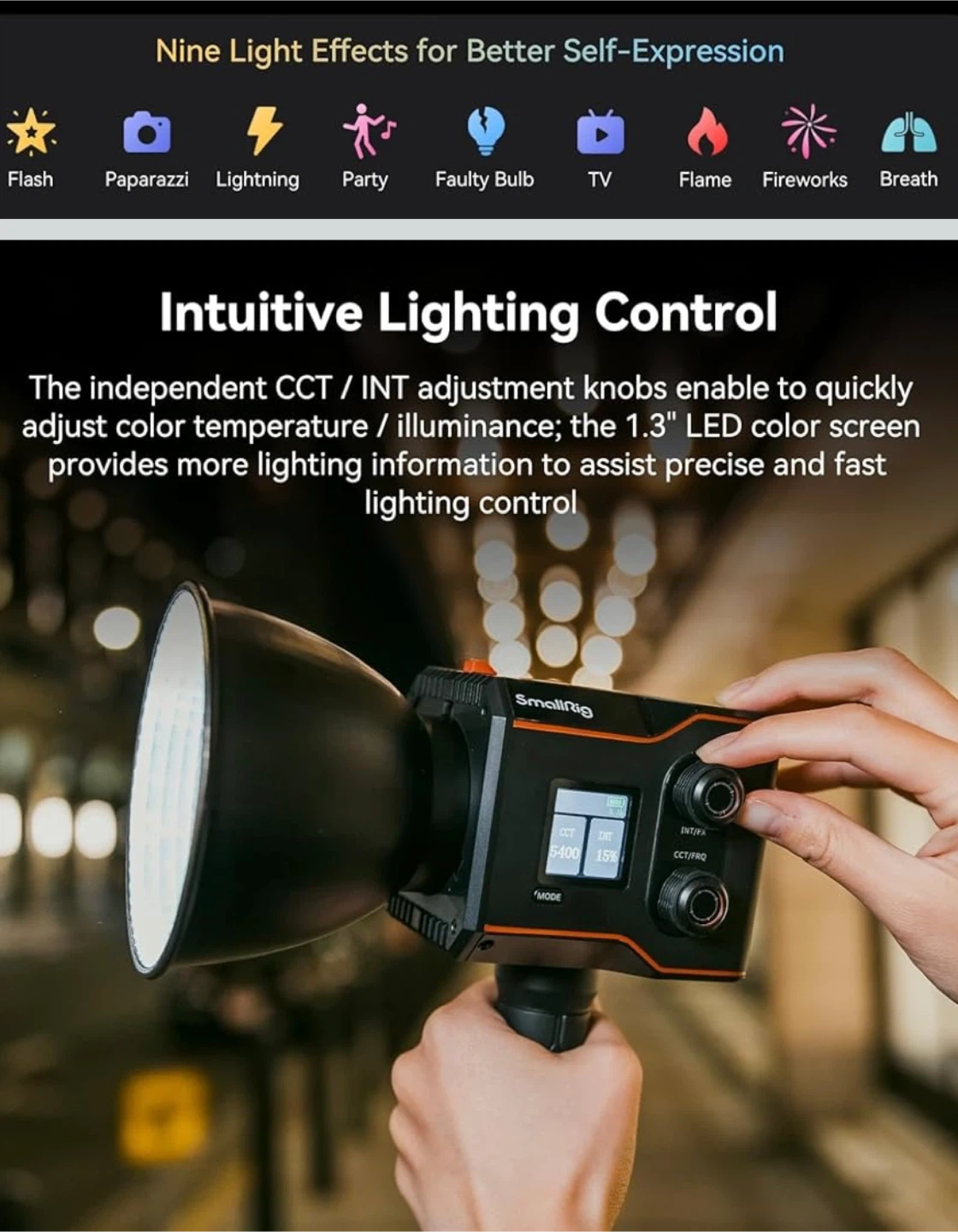 Simple & Precise Light Control: There is an independent CCT/INT adjustment knob on the side of the light body, which can quickly adjust the color temperature and illumination, with simple operation and timely feedback. The 1.3" LED color screen provides richer lighting information, allowing you to accurately control lighting parameters and find the light that is most suitable for the shooting scene.