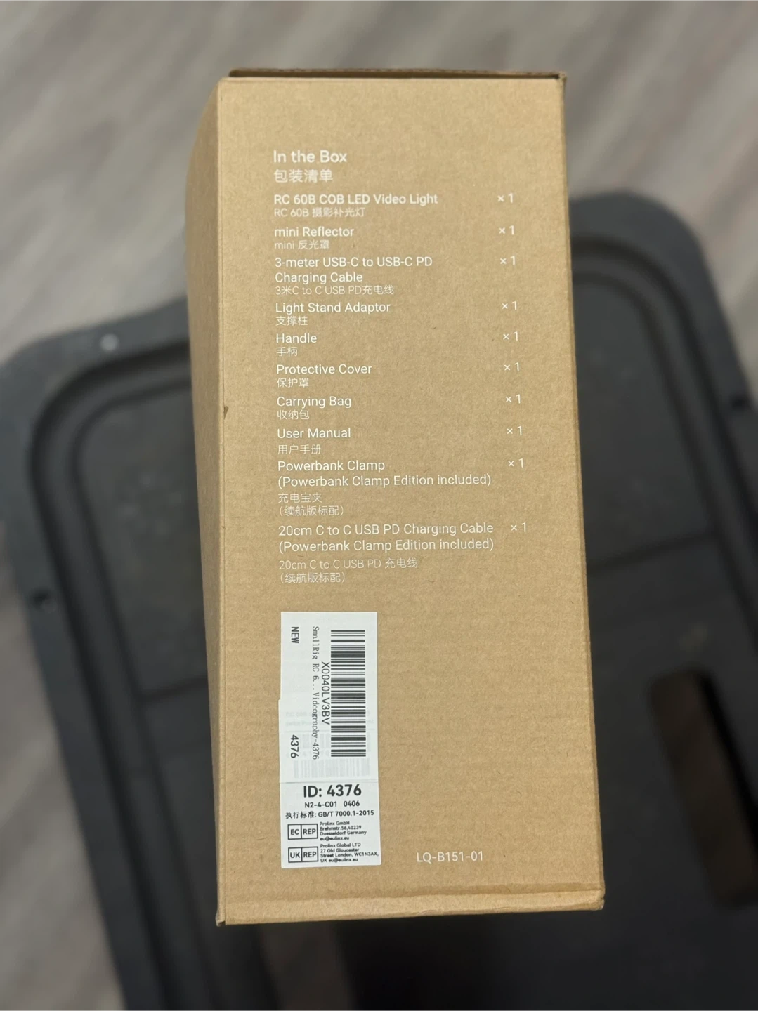 Package Includes: RC 60B LED Video Light x 1, mini Hyper Reflector x 1, 3m USB-C to USB-C PD Charging Cable x 1, Light Stand Adapter x 1, Grip Handle x 1, Protection Cover x 1, User Manual x1, Carrying Bag x1, Power Bank Holder x 1, 20cm USB-C to USB-C PD Charging Cable x 1