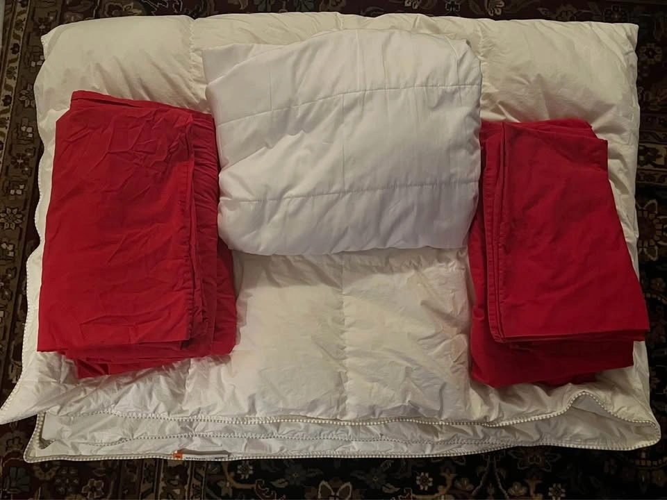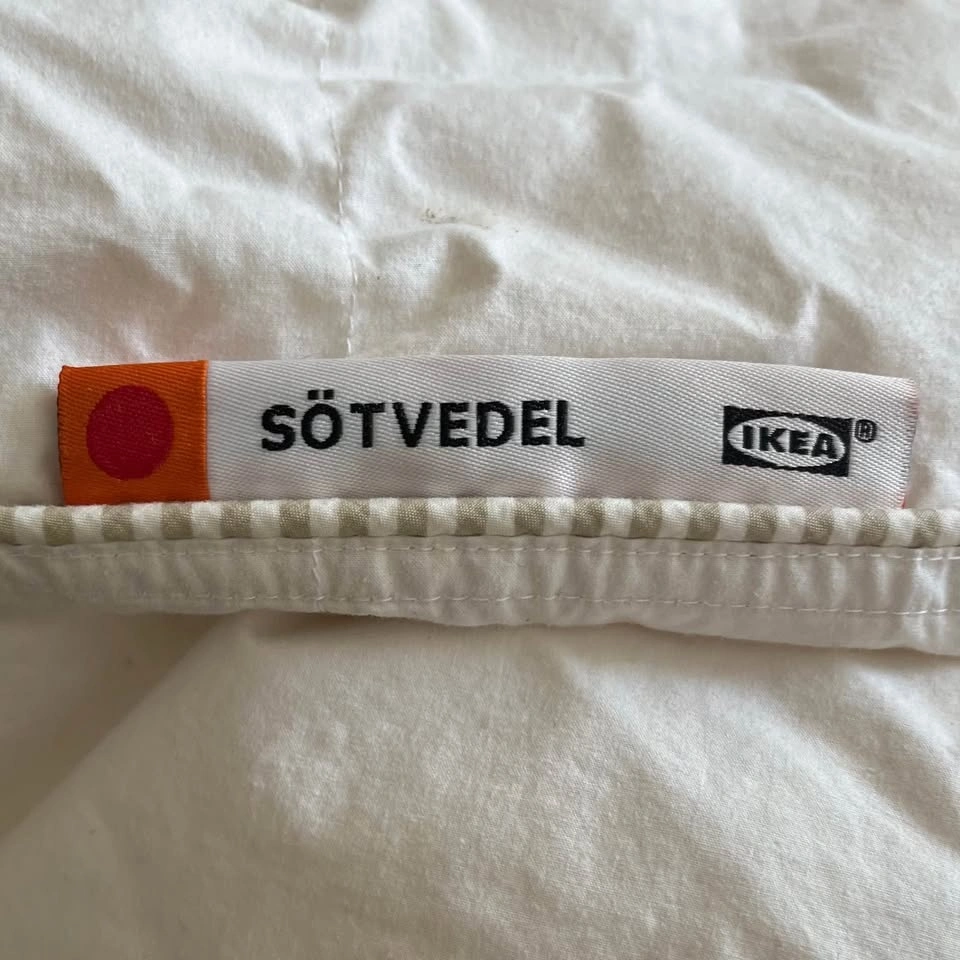 Also comes with an ultra-clean, medium firm IKEA twin mattress (always used with a protector), a warm-rated IKEA duck down/feather duvet, two complete twin cotton sheet sets, and a quilted mattress protector.
