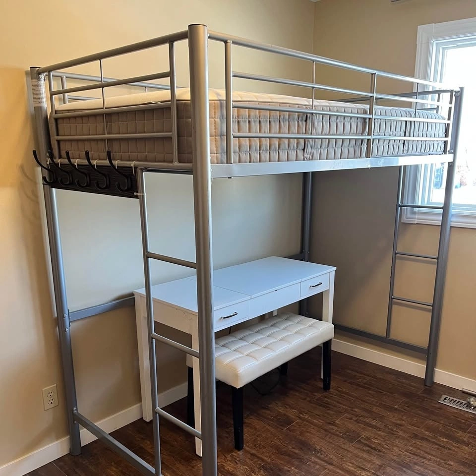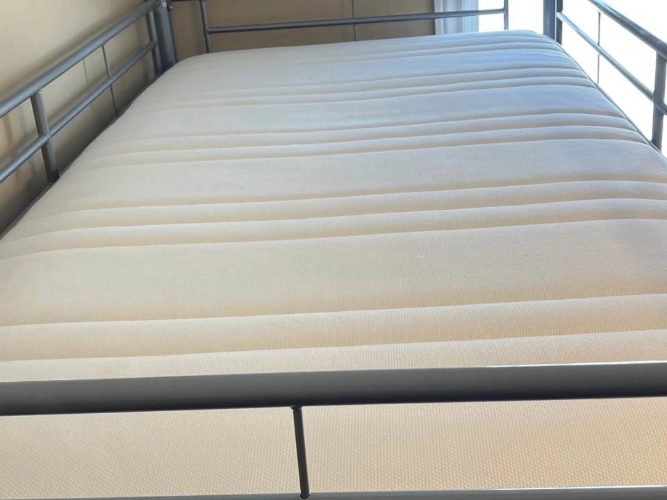 Also comes with an ultra-clean, medium firm IKEA twin mattress (always used with a protector), a warm-rated IKEA duck down/feather duvet, two complete twin cotton sheet sets, and a quilted mattress protector.