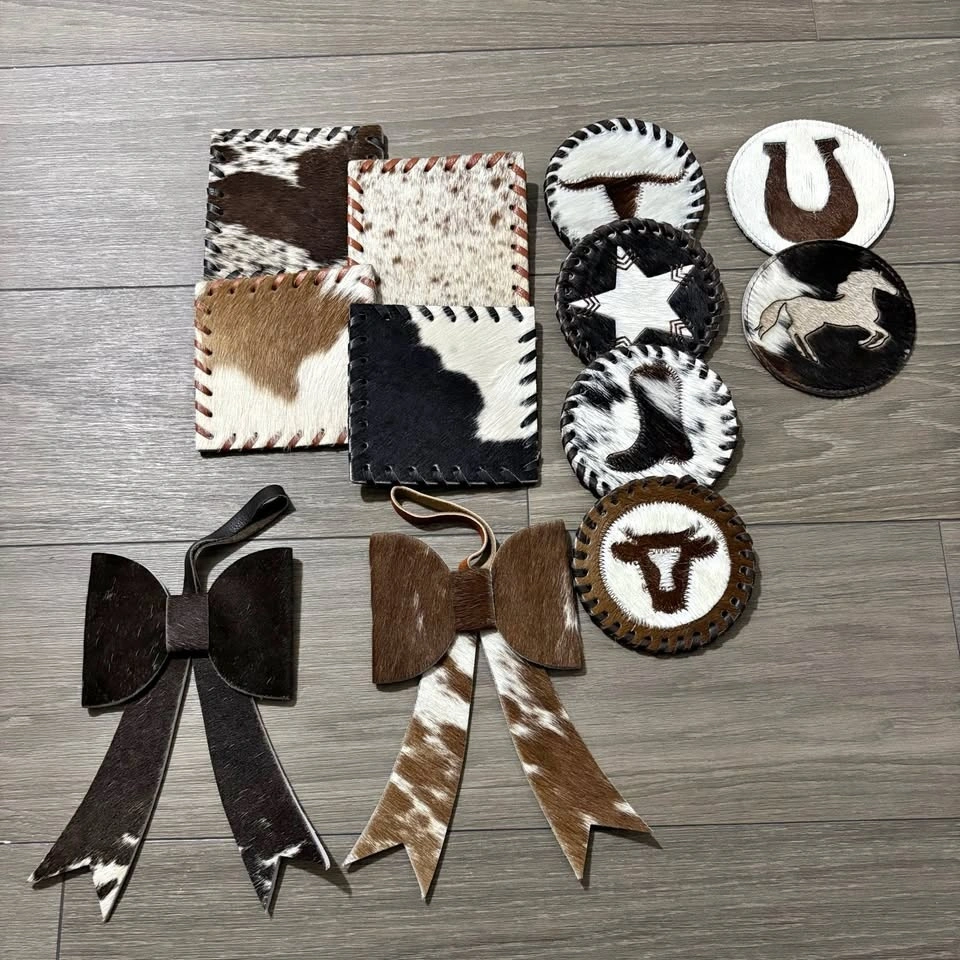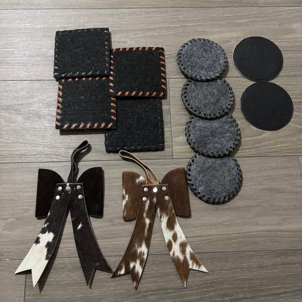 Selling new, one-of-a-kind genuine leather and cowhide items, bought in Texas. Asking $30 per bow or per set of 4 coasters, and $15 for a set of 2 hard leather backing coasters. Pick up in the West end.