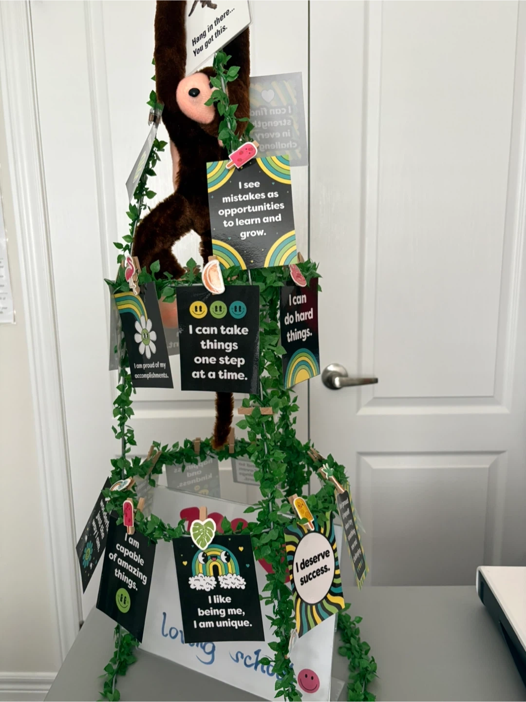 This fun plush monkey is decorated with inspirational quote cards for encouragement. It's perfect for a classroom or child's room. Cards include messages like 'Hang in there... You got this!' and 'I can make a difference and more! 21 cards in total! Cards are laminated.