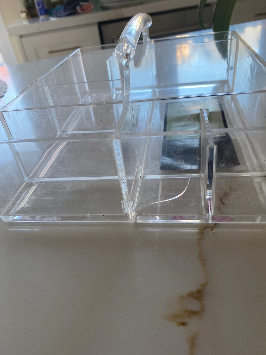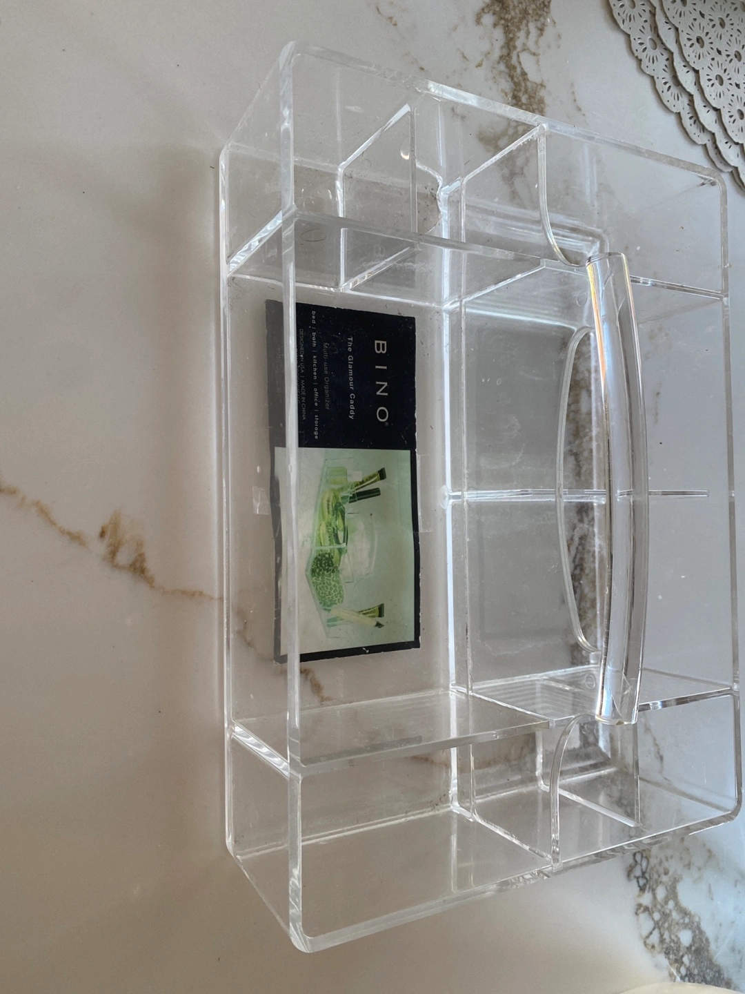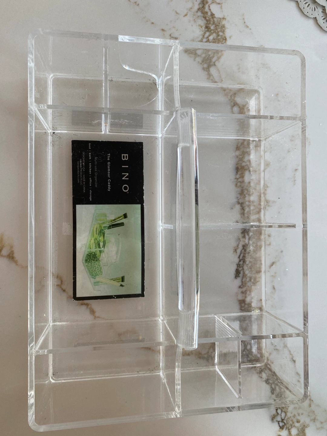 Multi-compartment organiser. Clear acrylic construction. Features a convenient carrying handle. Perfect for makeup, stationery, or other small items. some minor wear.