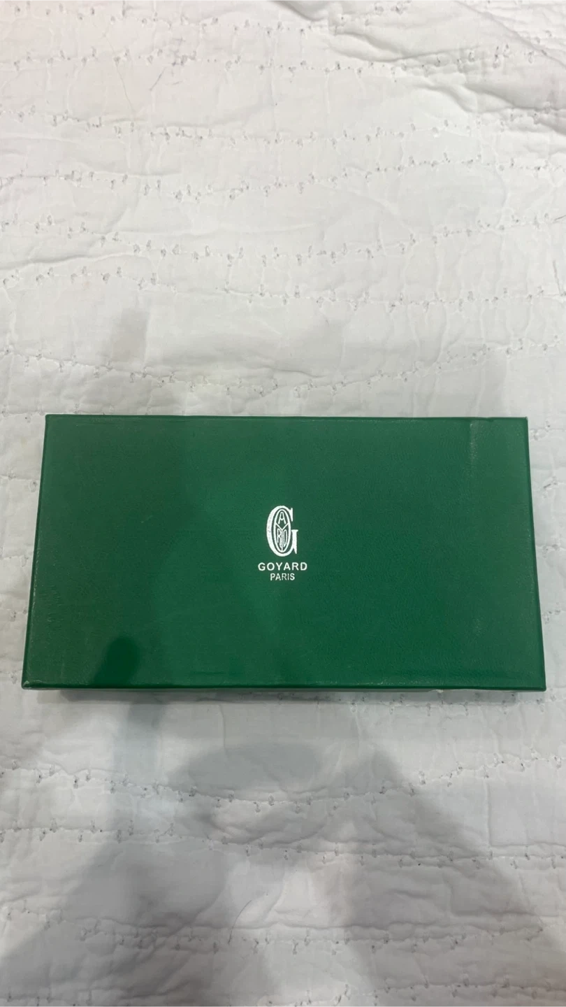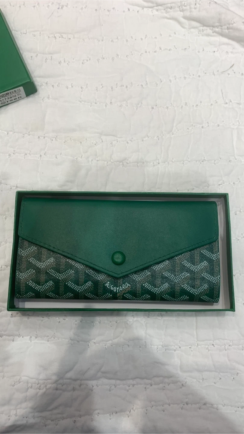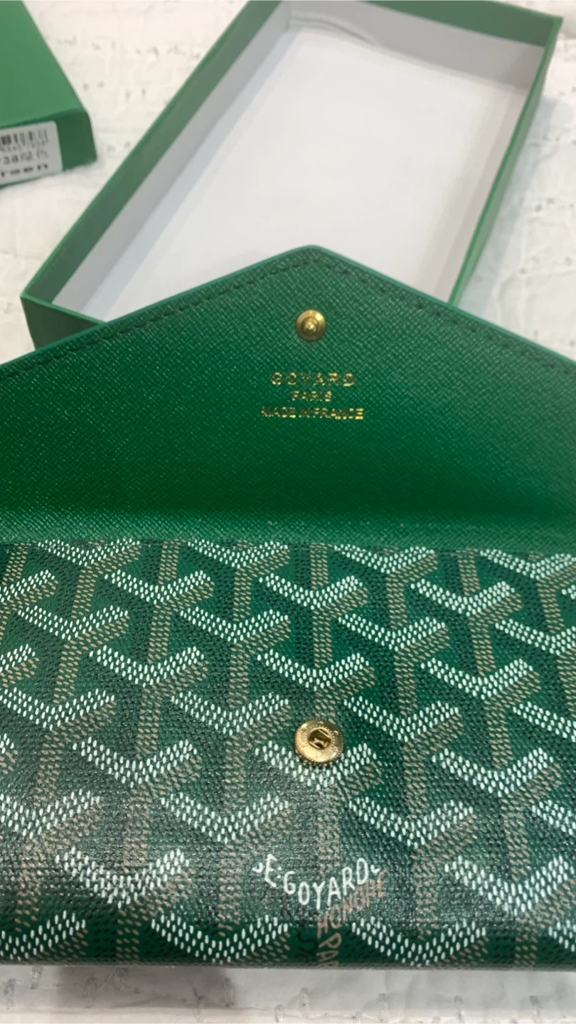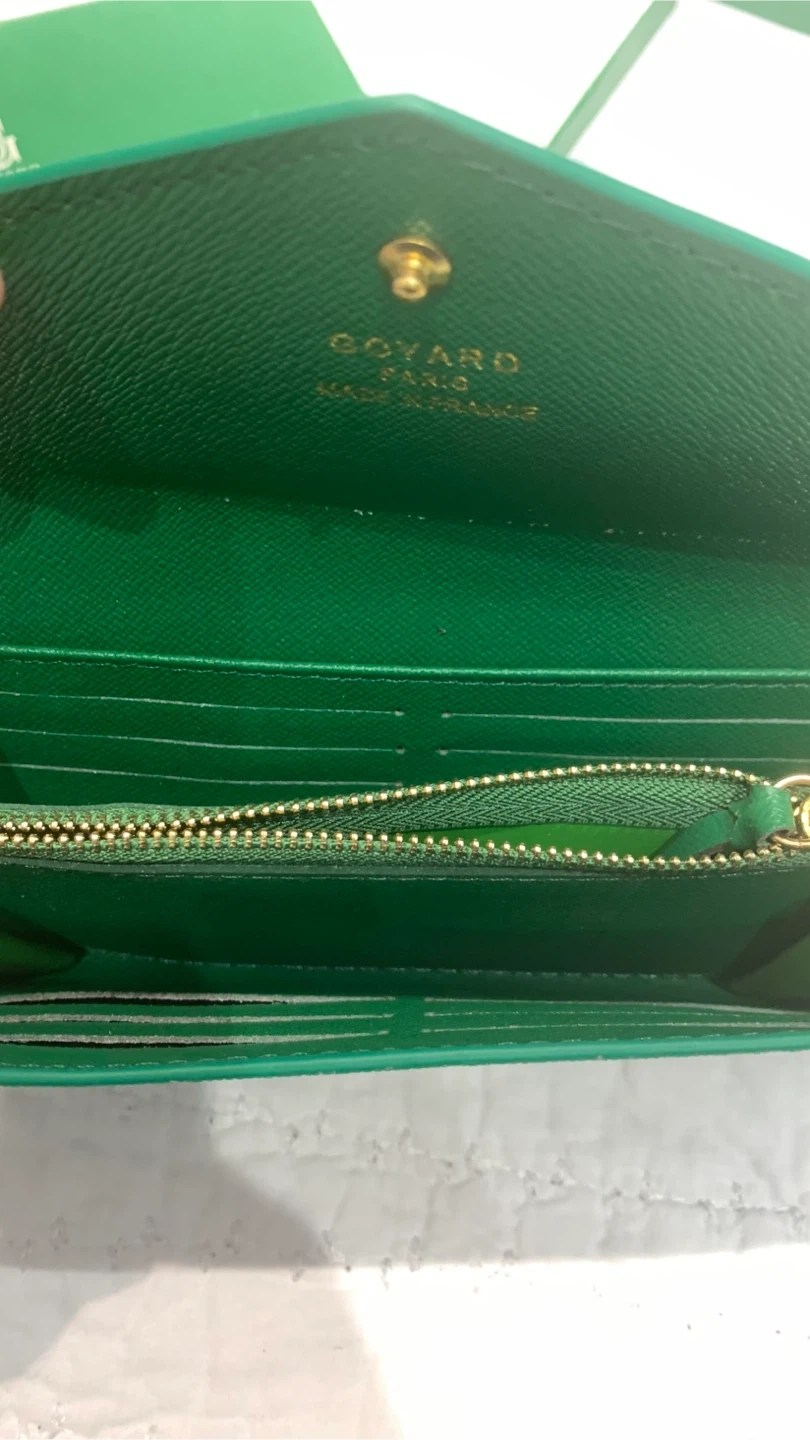 This is a Goyard wallet in a classic green colour. It features the iconic Goyardine canvas and a secure snap closure. The interior has multiple card slots and a zippered coin pocket. It comes with its box.